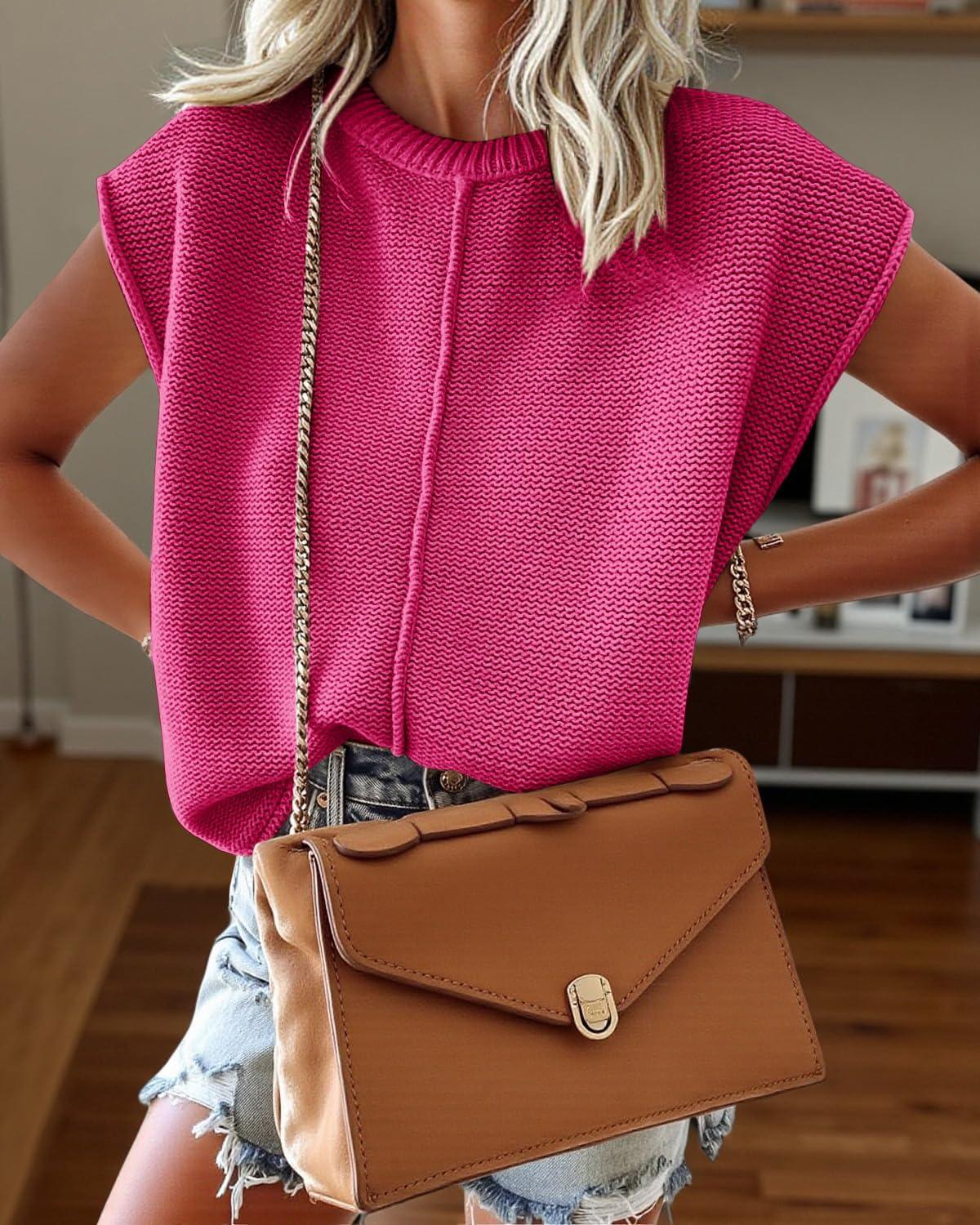 Saodimallsu Womens Summer Cap Sleeve Tops Casual Crew Neck Loose Fit Knit Lightweight Sweater Pullover Top(Rose Red)