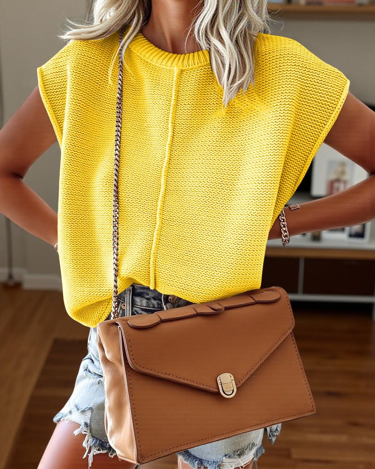 Saodimallsu Womens Summer Cap Sleeve Tops Casual Crew Neck Loose Fit Knit Lightweight Sweater Pullover Top(Yellow)