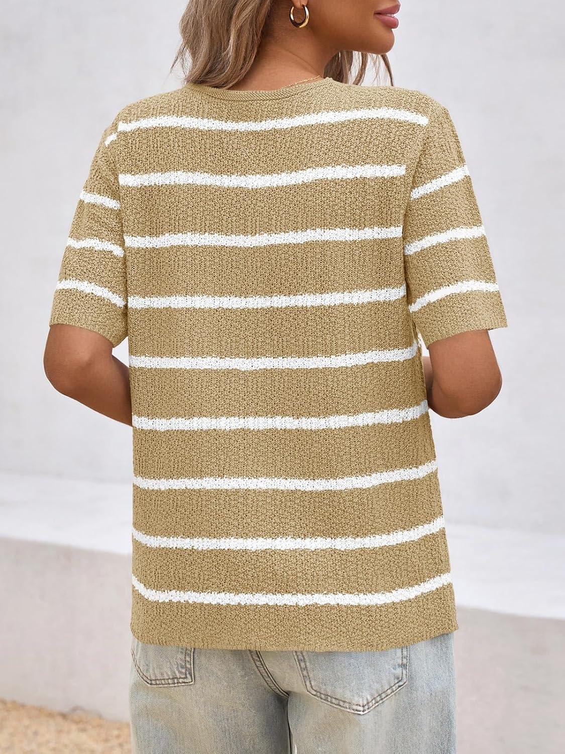 Saodimallsu Womens Summer Short Sleeve Sweater Tops Striped V Neck T Shirts Casual Loose Fit 2025 Trendy Knit Top(Khaki)