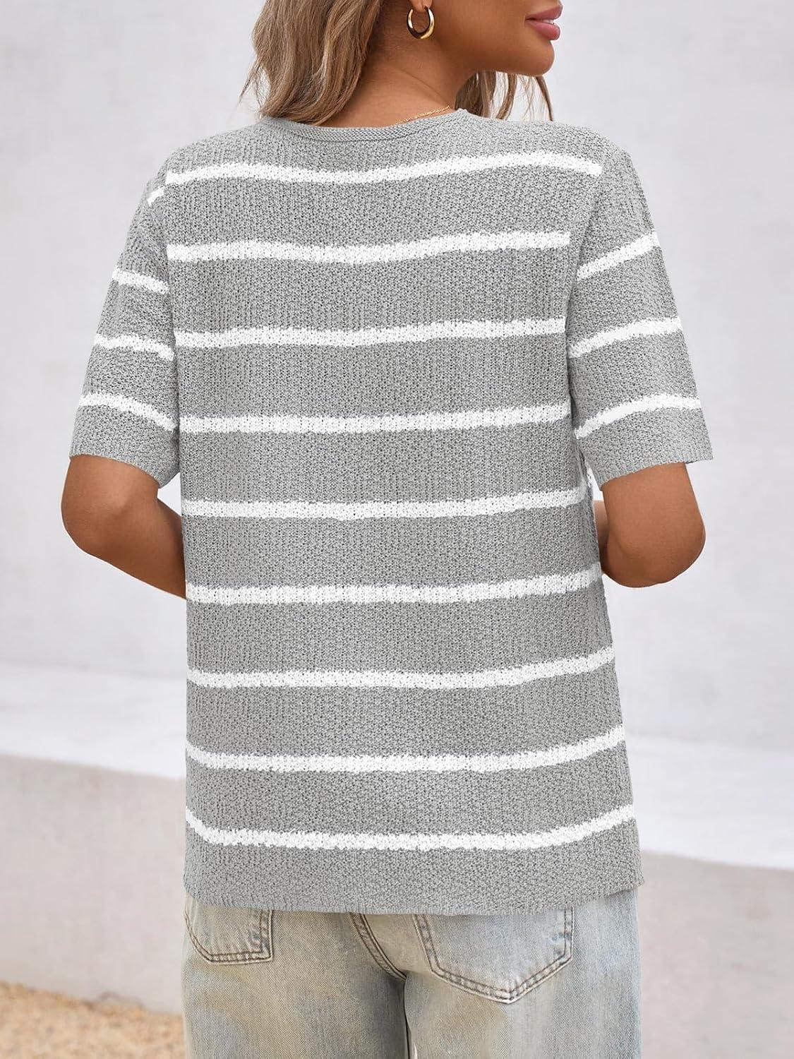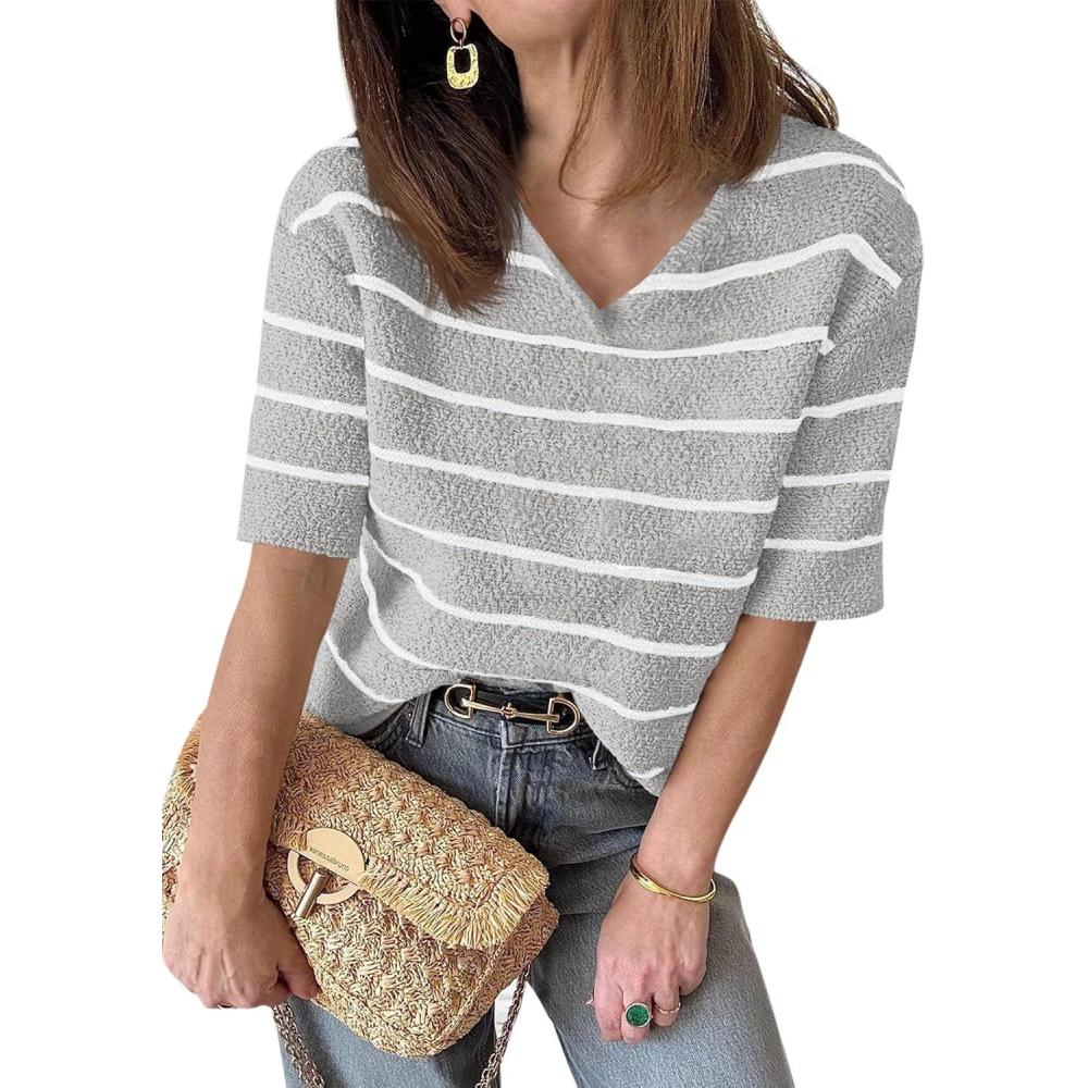 Saodimallsu Womens Summer Short Sleeve Sweater Tops Striped V Neck T Shirts Casual Loose Fit 2025 Trendy Knit Top(Light Gray)
