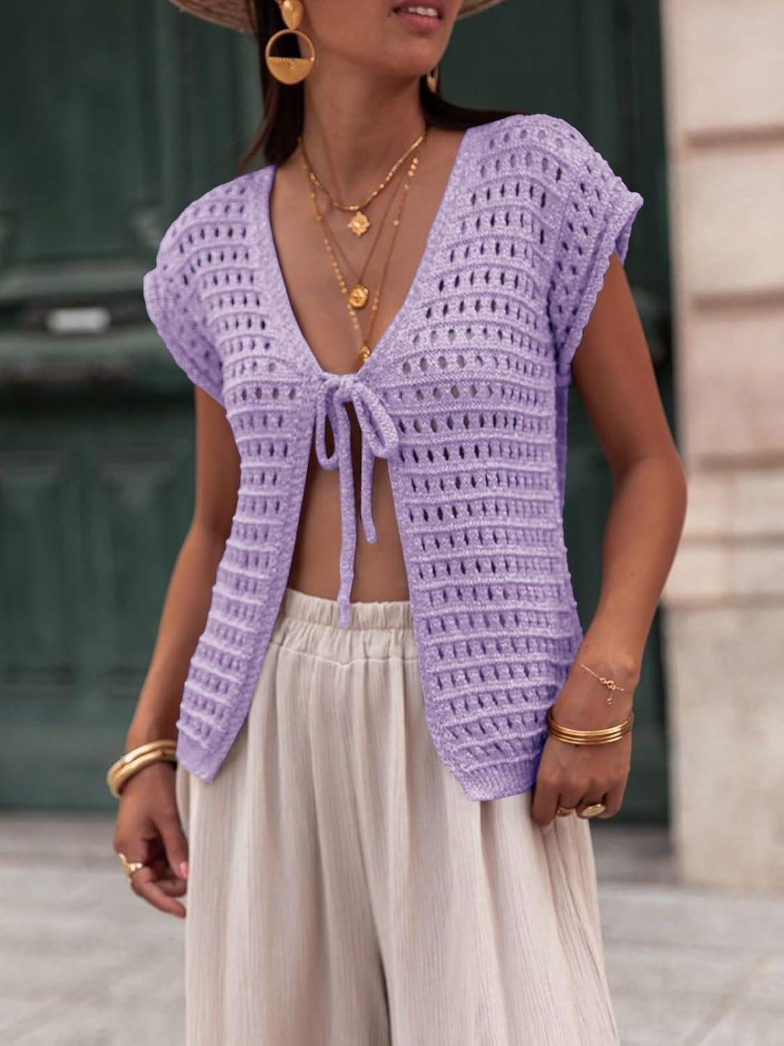 Saodimallsu Womens Tie Crochet Shrug Short Sleeve Open Front Lightweight Knit Cropped Cardigan Sweaters Cover Up(Purple)
