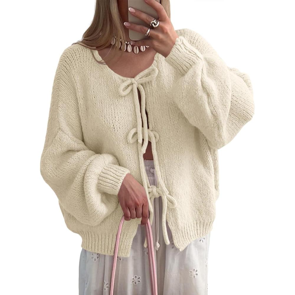 Saodimallsu Womens Tie Front Cardigan Sweaters Cute Bow Puff Long Sleeve 2025 Fall Loose Ribbed Knit Trendy Sweater Tops(Apricot)