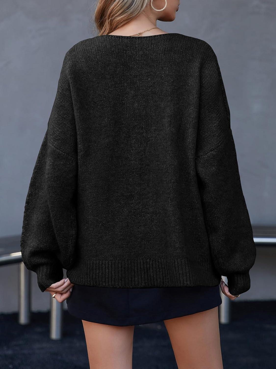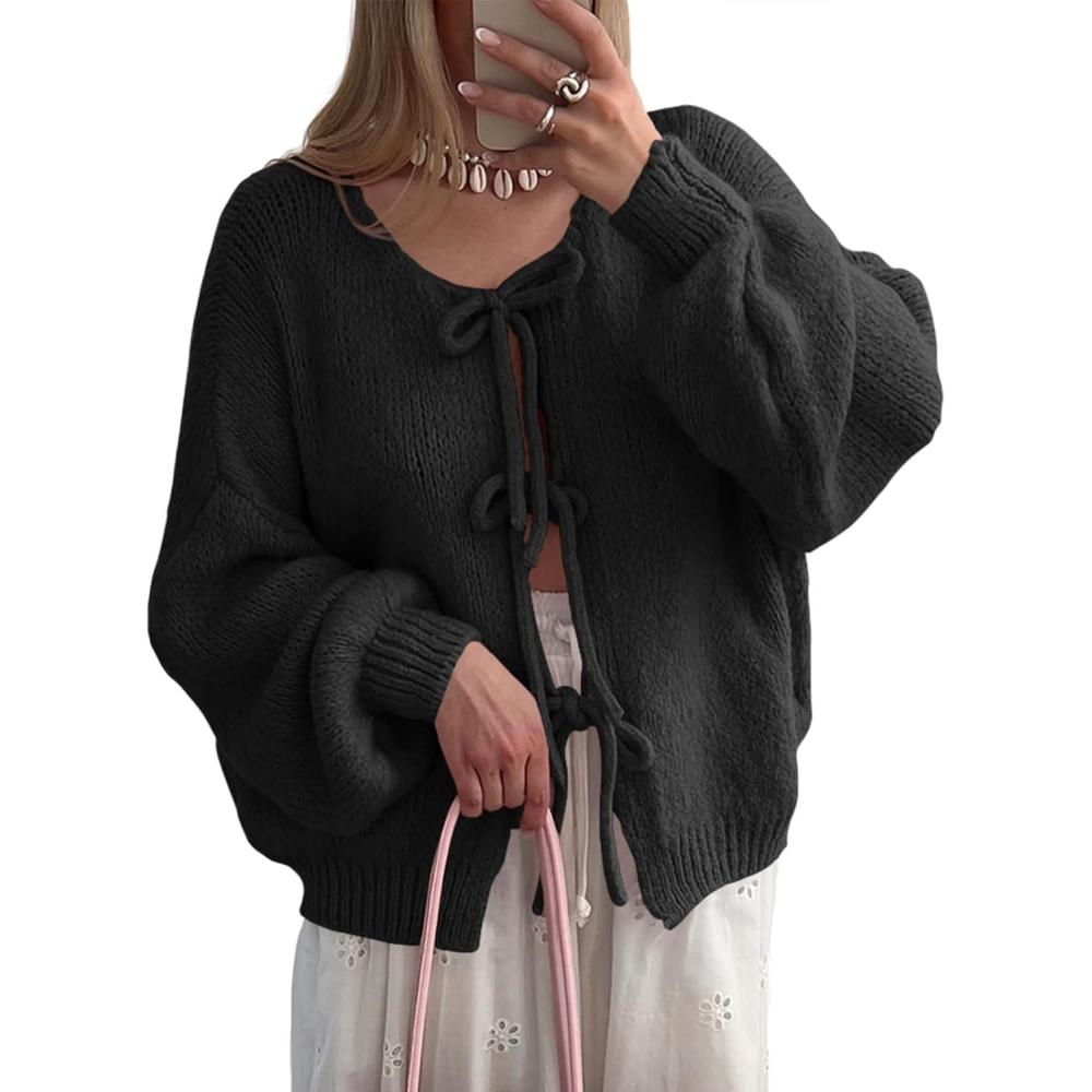 Saodimallsu Womens Tie Front Cardigan Sweaters Cute Bow Puff Long Sleeve 2025 Fall Loose Ribbed Knit Trendy Sweater Tops(Black)
