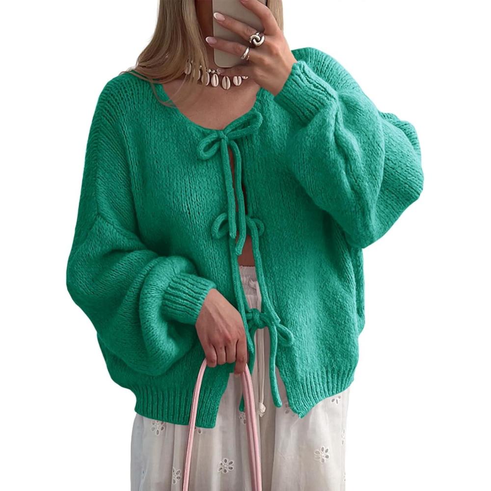 Saodimallsu Womens Tie Front Cardigan Sweaters Cute Bow Puff Long Sleeve 2025 Fall Loose Ribbed Knit Trendy Sweater Tops(Green)
