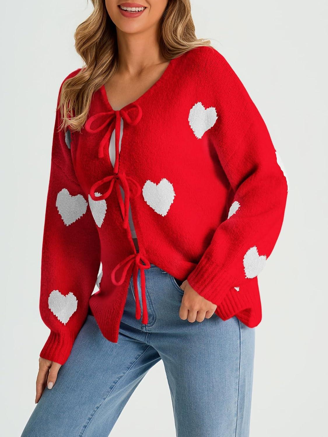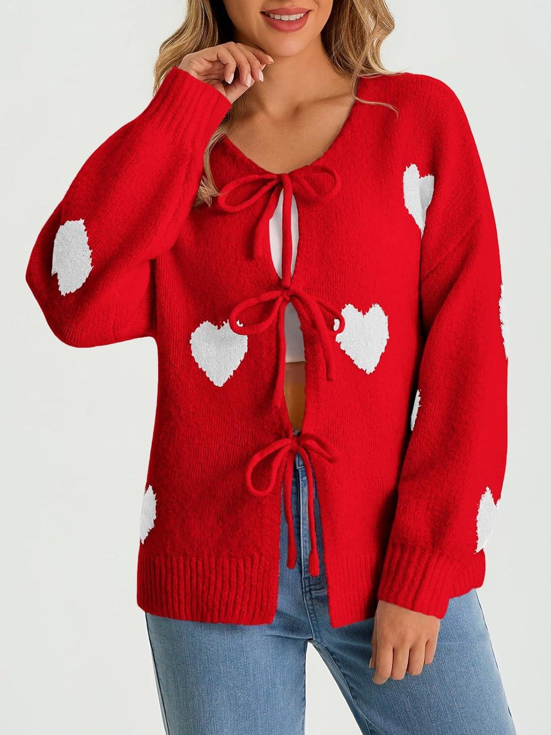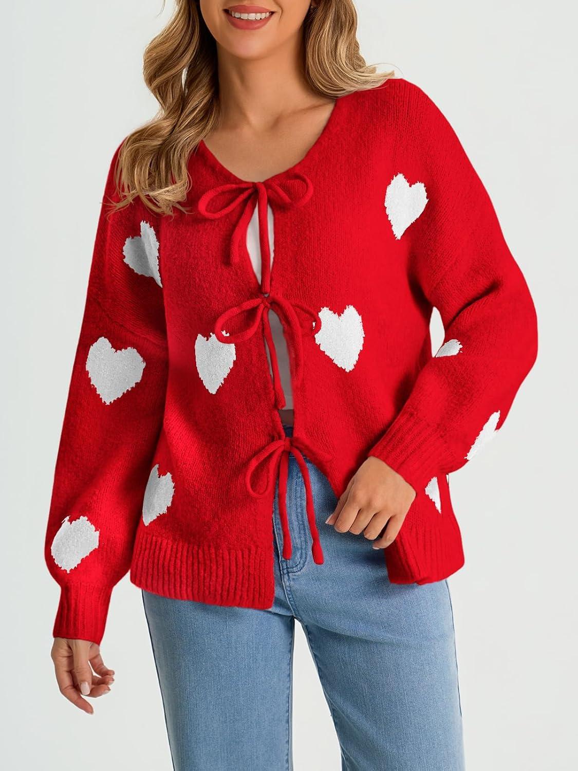 Saodimallsu Womens Tie Front Cardigan Sweaters Cute Bow Puff Long Sleeve 2025 Fall Loose Ribbed Knit Trendy Sweater Tops(Red-a)