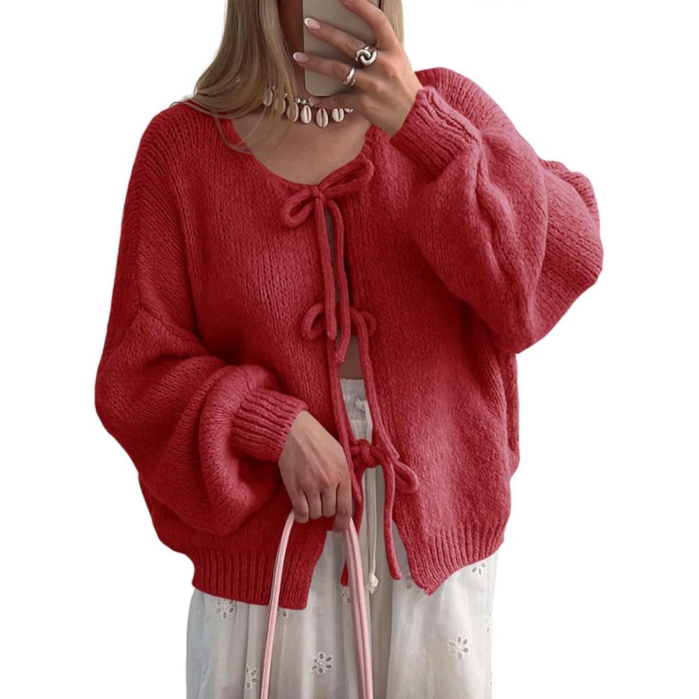 Saodimallsu Womens Tie Front Cardigan Sweaters Cute Bow Puff Long Sleeve 2025 Fall Loose Ribbed Knit Trendy Sweater Tops(Red)