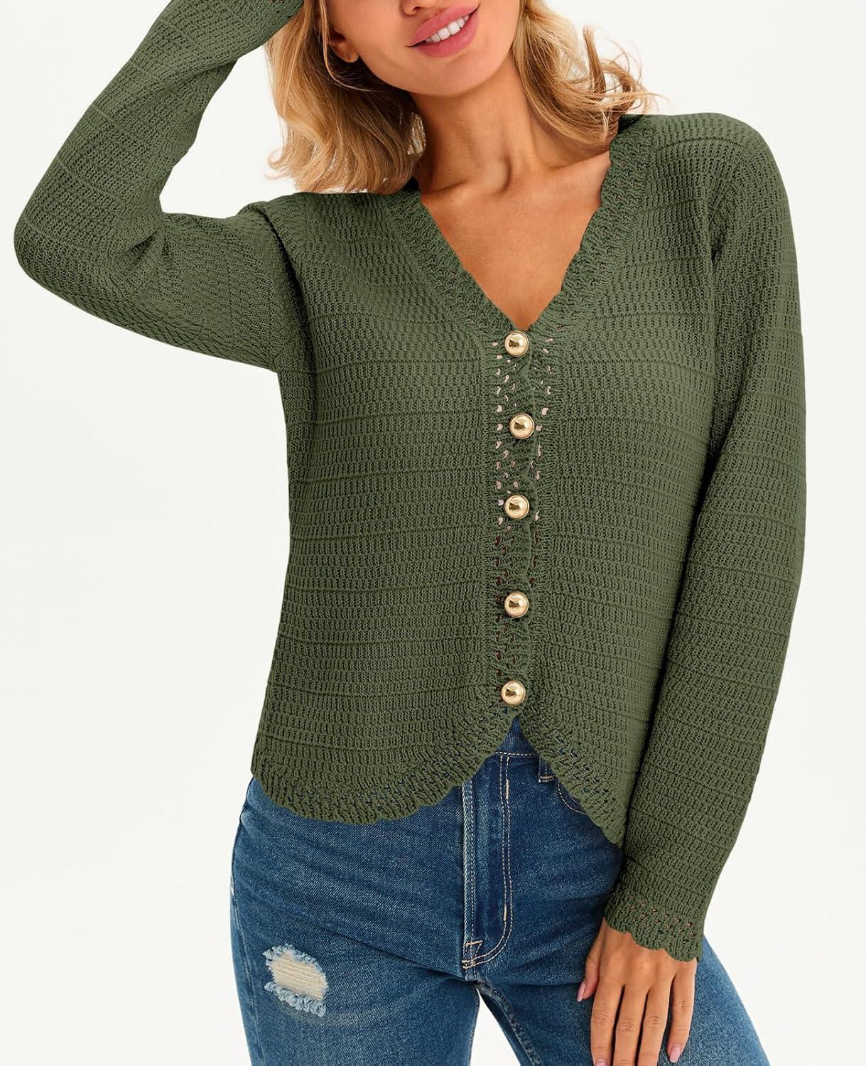 Saodimallsu Womens V Neck Cardigan Sweaters Button Up Cropped Boho Knit Long Sleeve Loose Trendy Sweater Tops(Army Green)