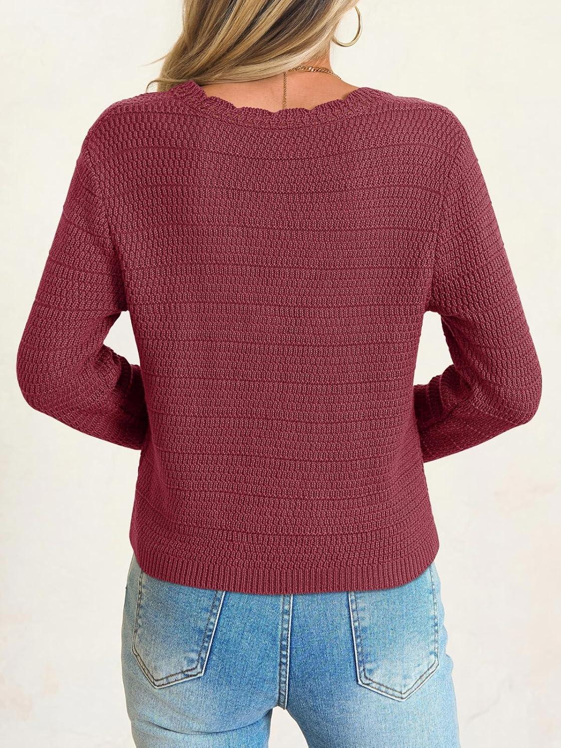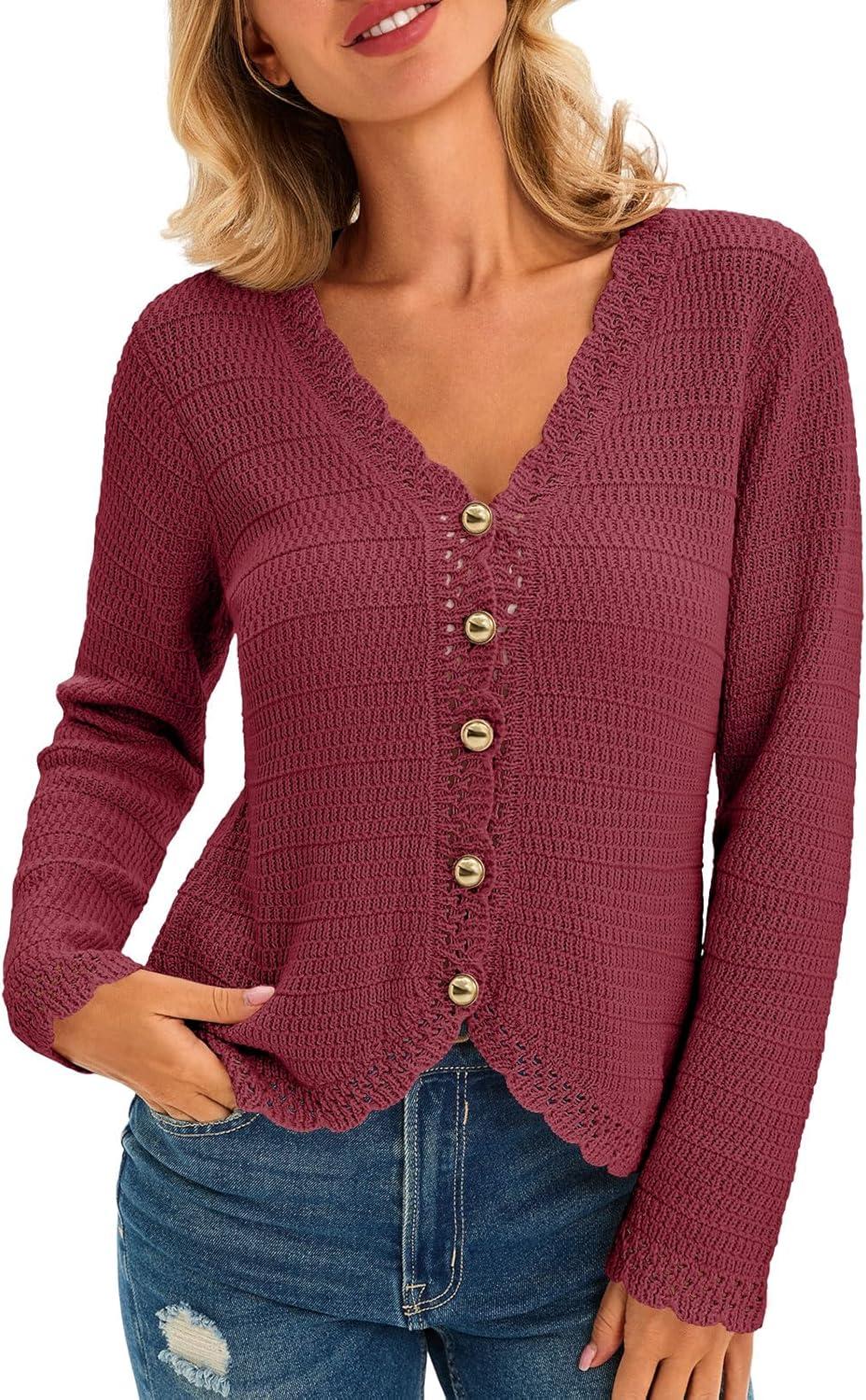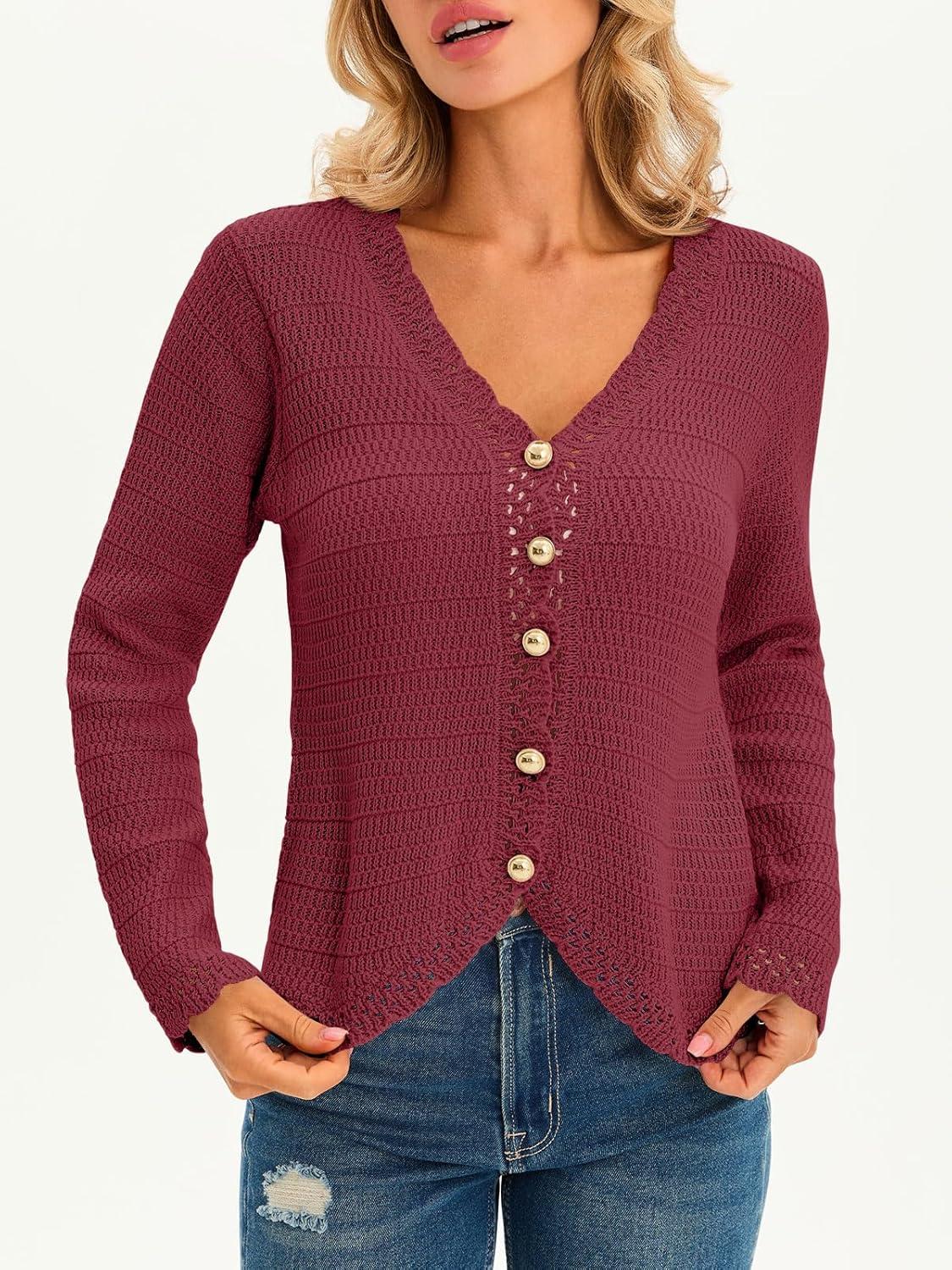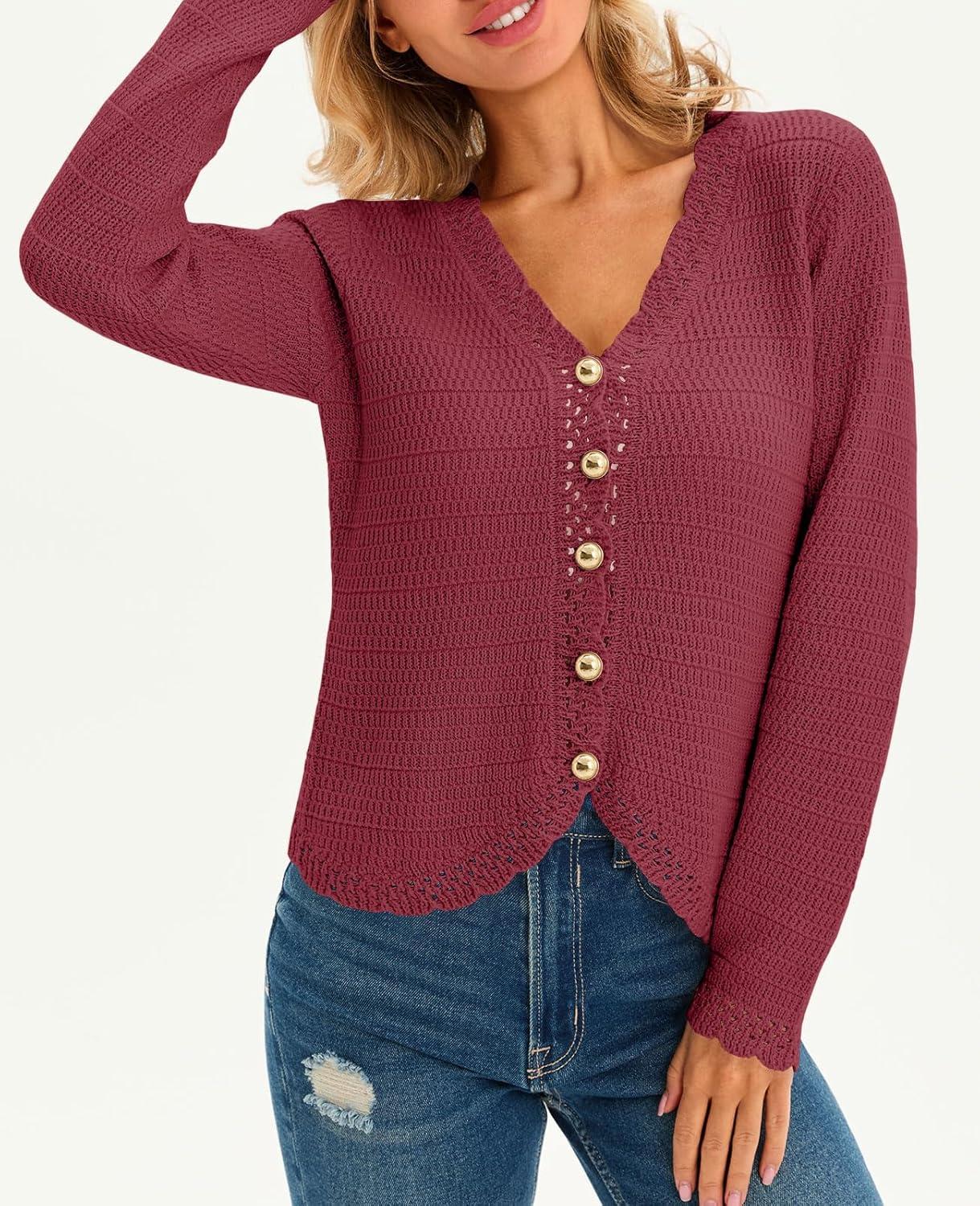 Saodimallsu Womens V Neck Cardigan Sweaters Button Up Cropped Boho Knit Long Sleeve Loose Trendy Sweater Tops(Burgundy)