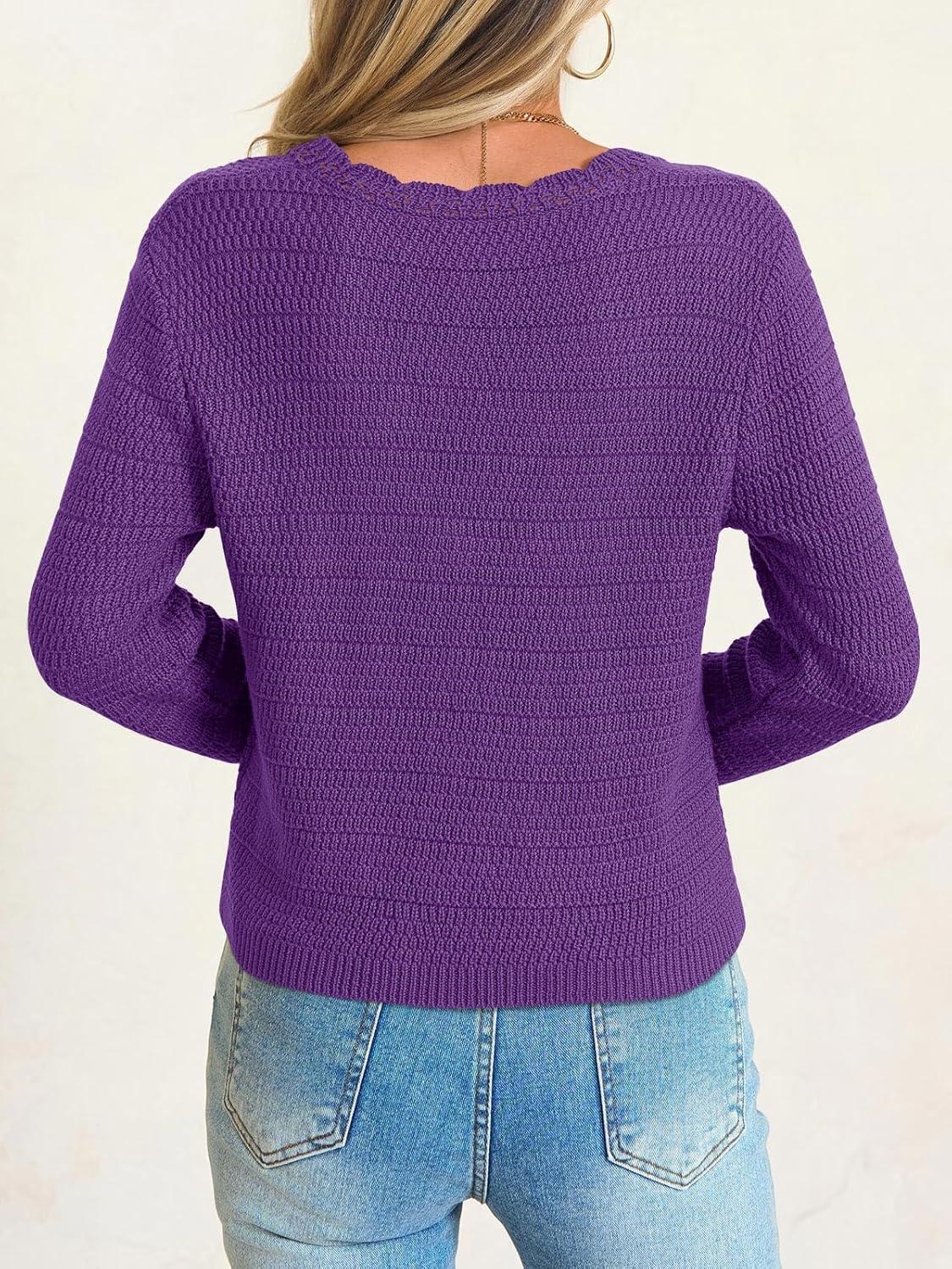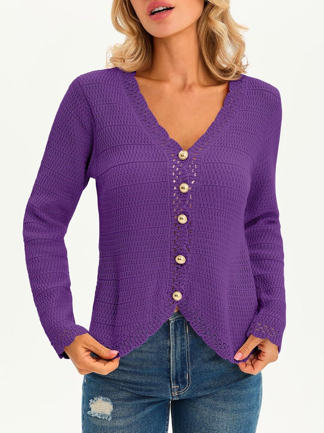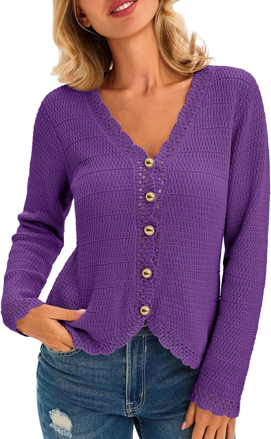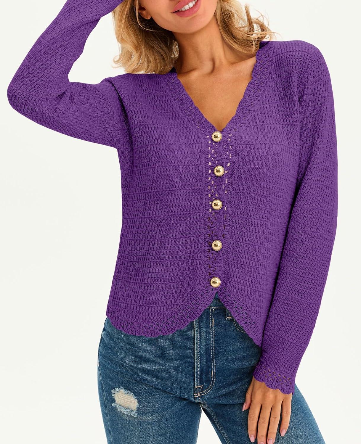 Saodimallsu Womens V Neck Cardigan Sweaters Button Up Cropped Boho Knit Long Sleeve Loose Trendy Sweater Tops(Purple)