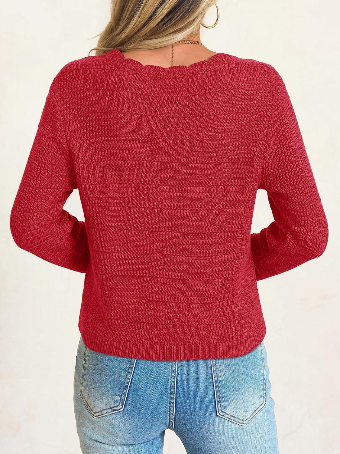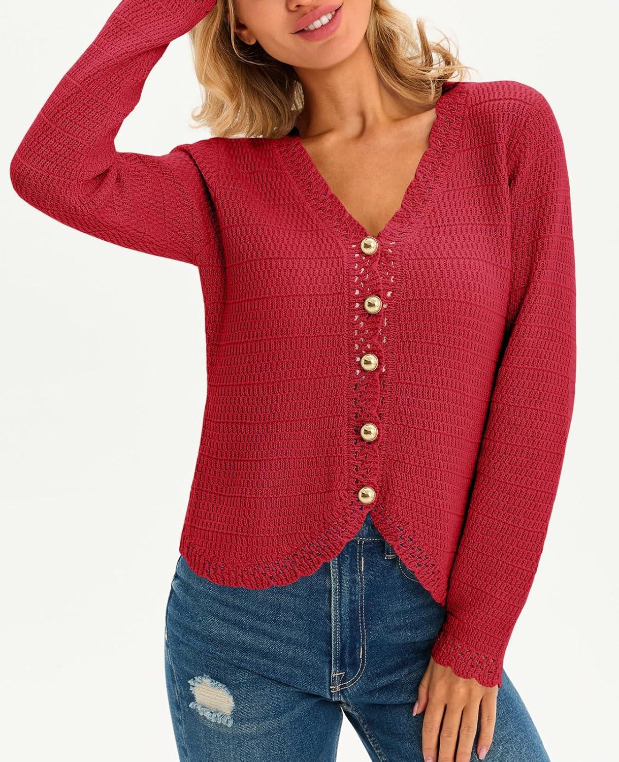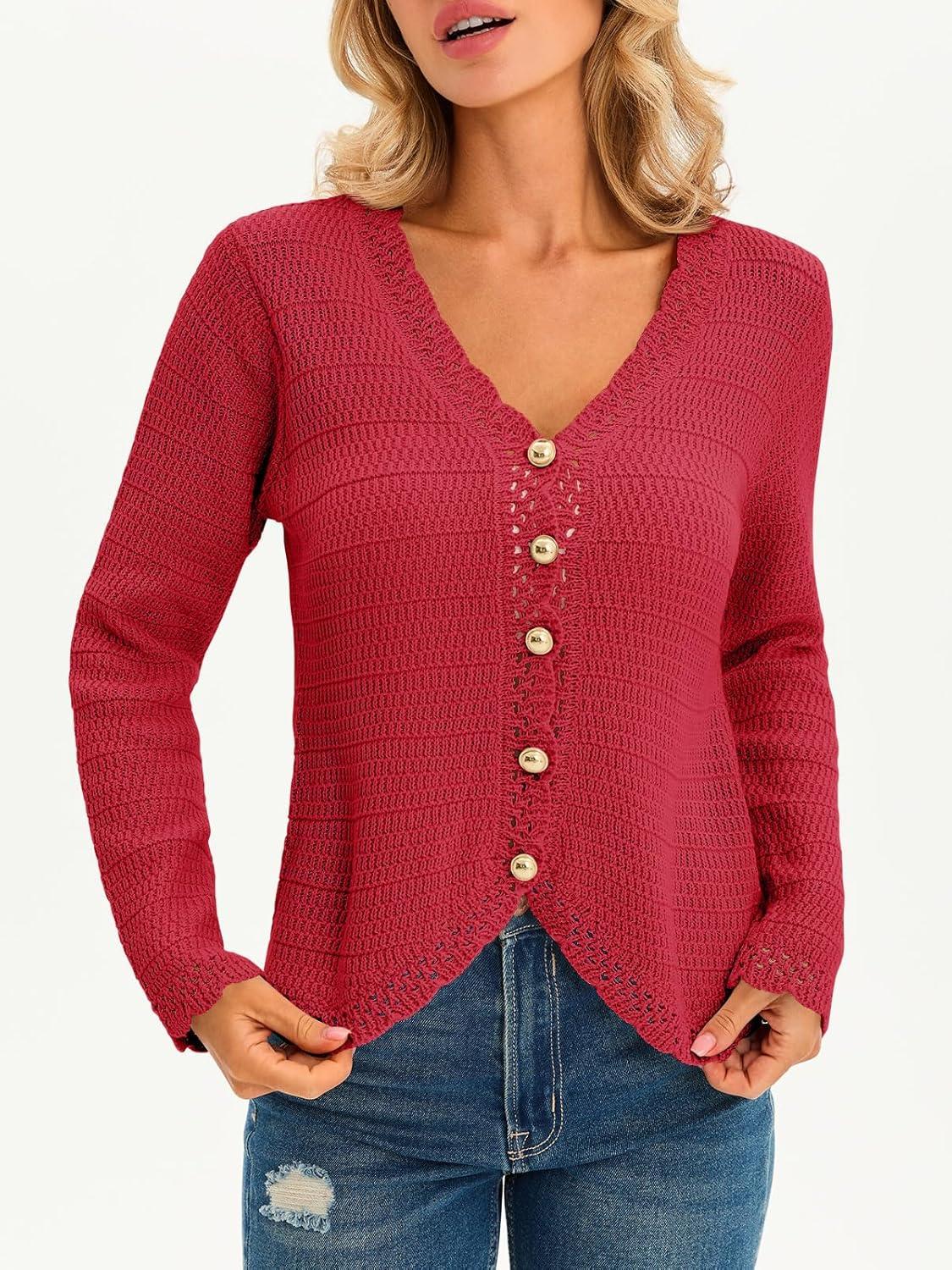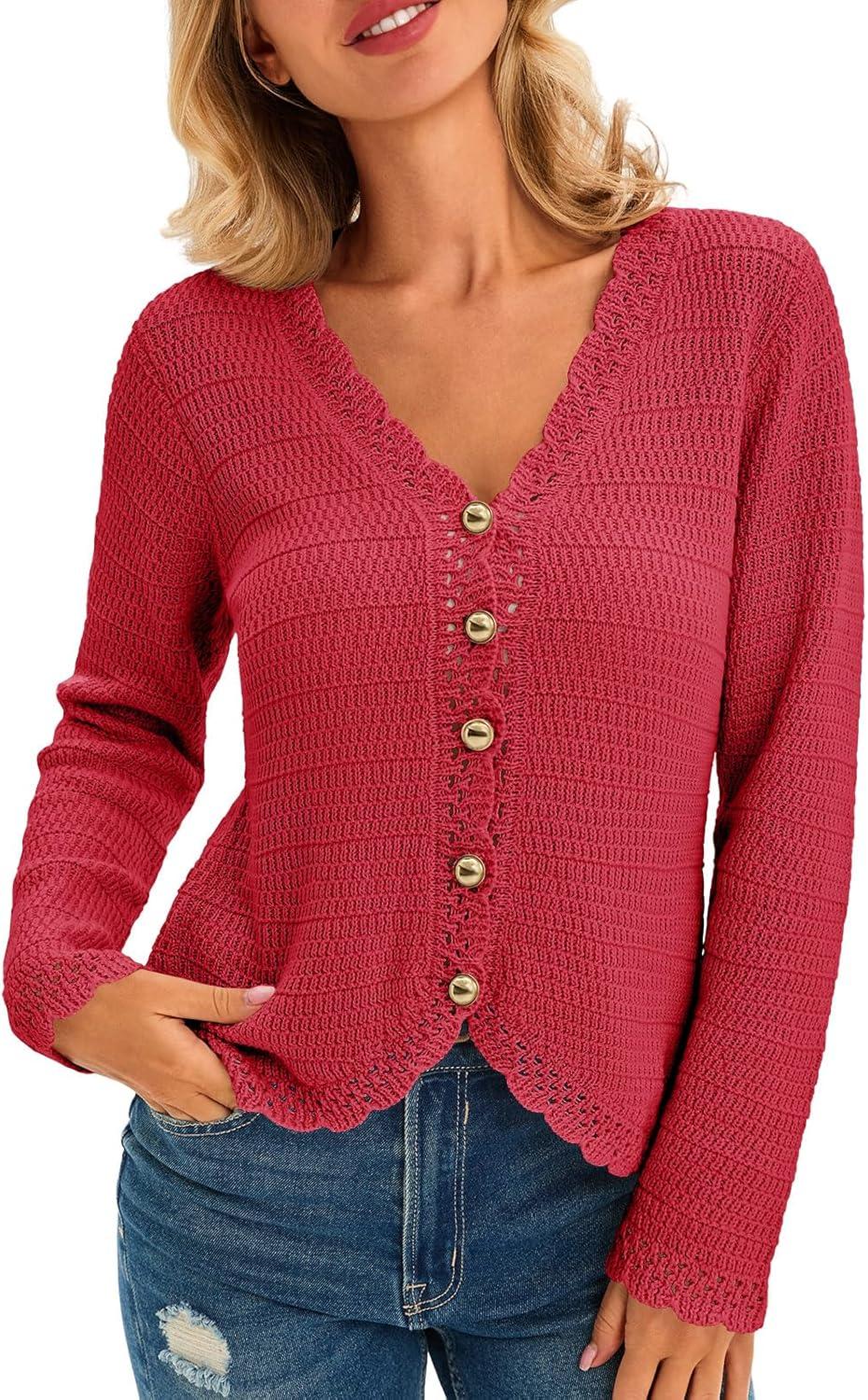 Saodimallsu Womens V Neck Cardigan Sweaters Button Up Cropped Boho Knit Long Sleeve Loose Trendy Sweater Tops(Red)
