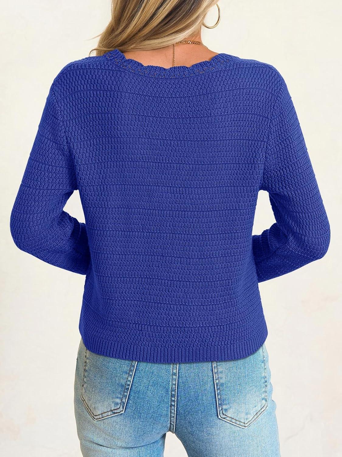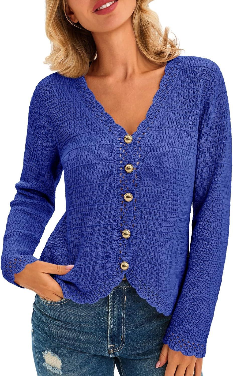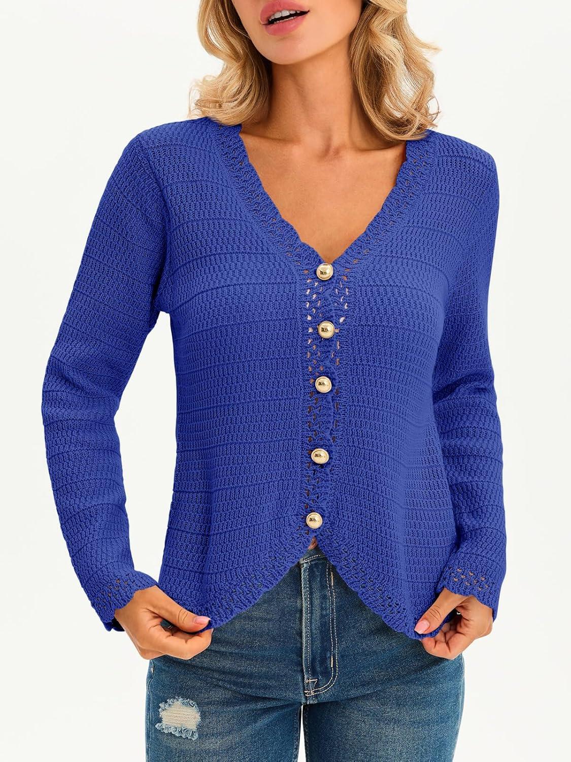 Saodimallsu Womens V Neck Cardigan Sweaters Button Up Cropped Boho Knit Long Sleeve Loose Trendy Sweater Tops(Royal Blue)