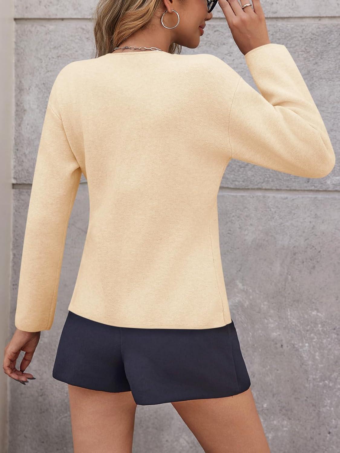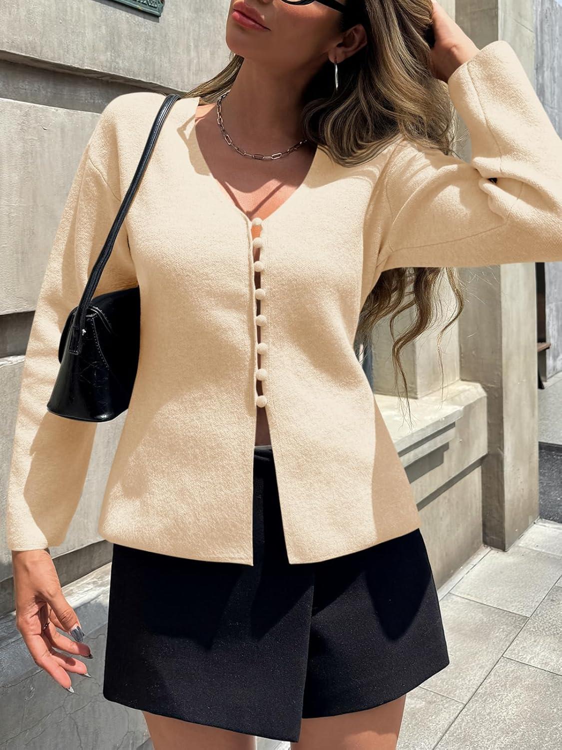 Saodimallsu Womens V Neck Cardigan Sweaters Button Up Fall Trendy Front Split Long Sleeve Sweater Blazer(Beige)