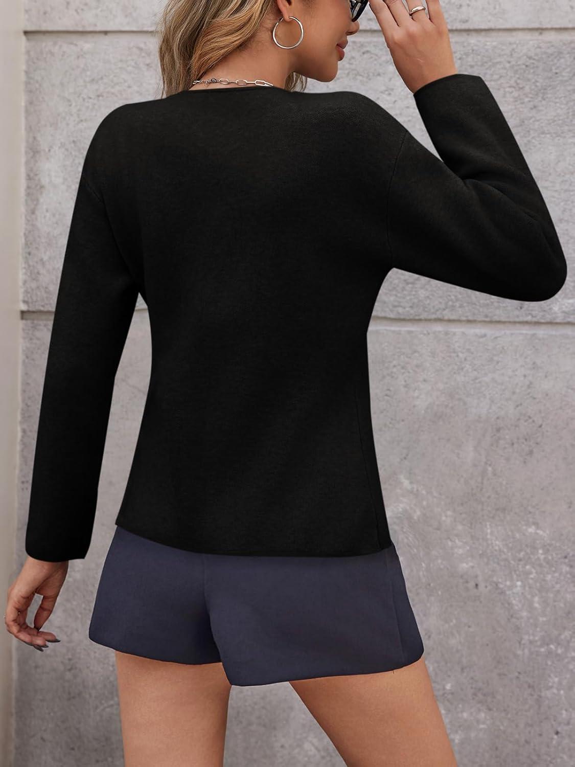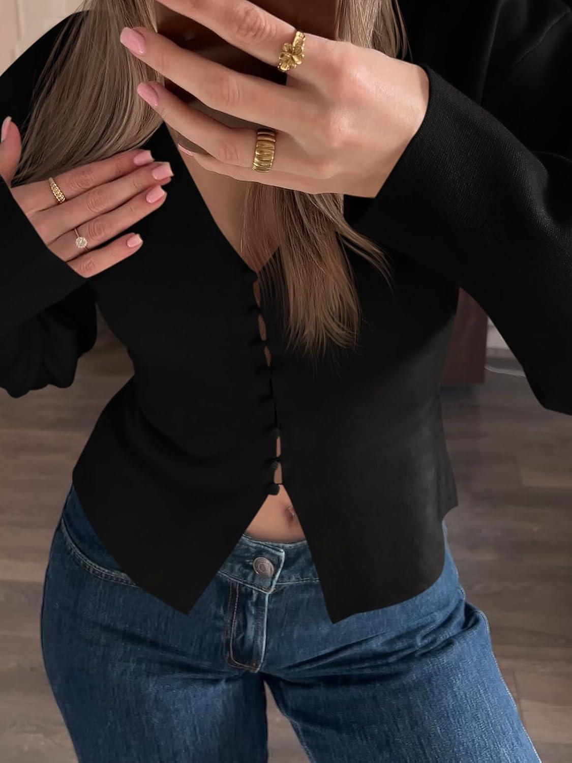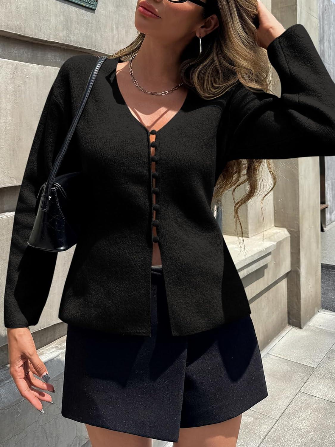 Saodimallsu Womens V Neck Cardigan Sweaters Button Up Fall Trendy Front Split Long Sleeve Sweater Blazer(Black)