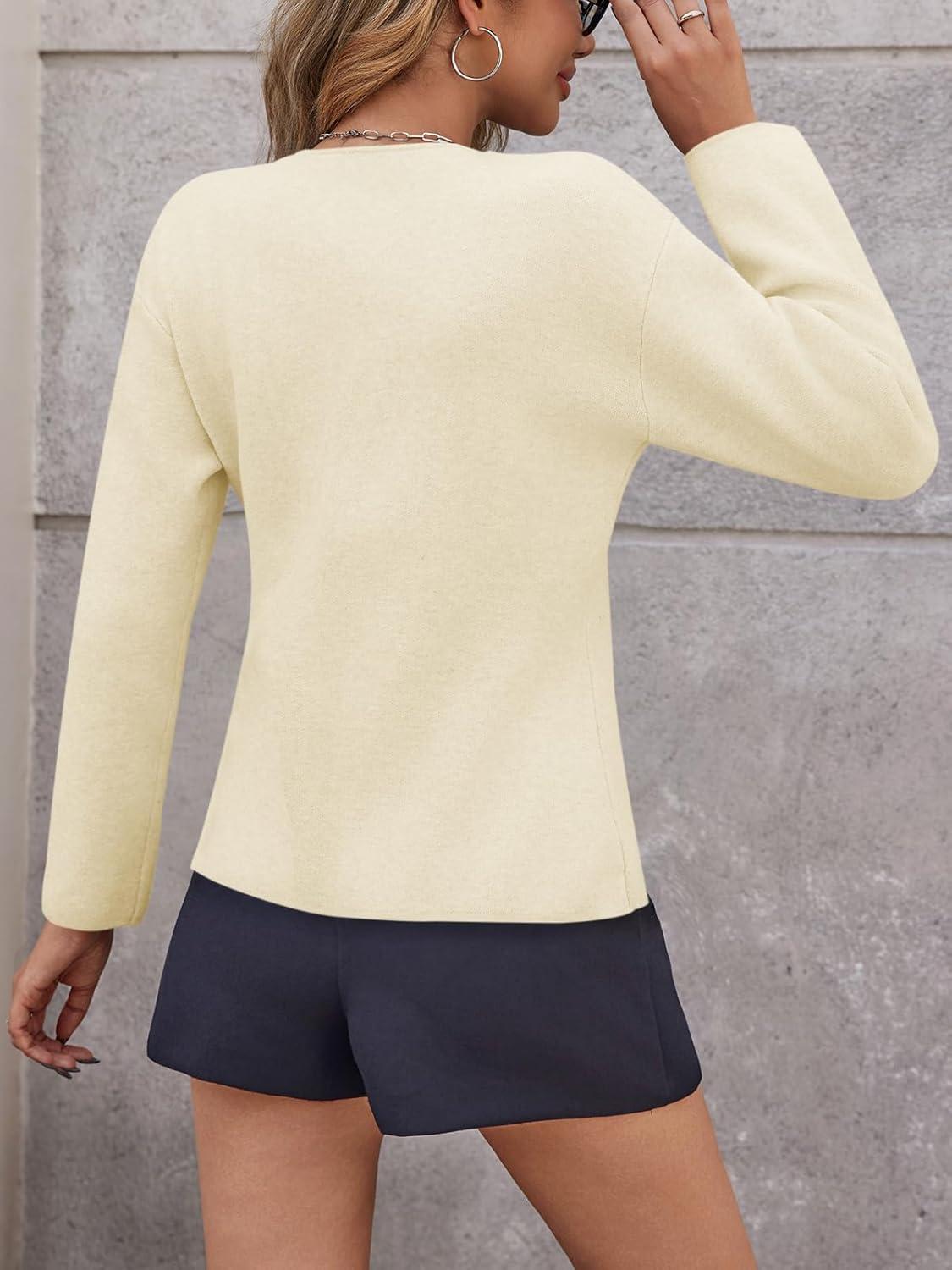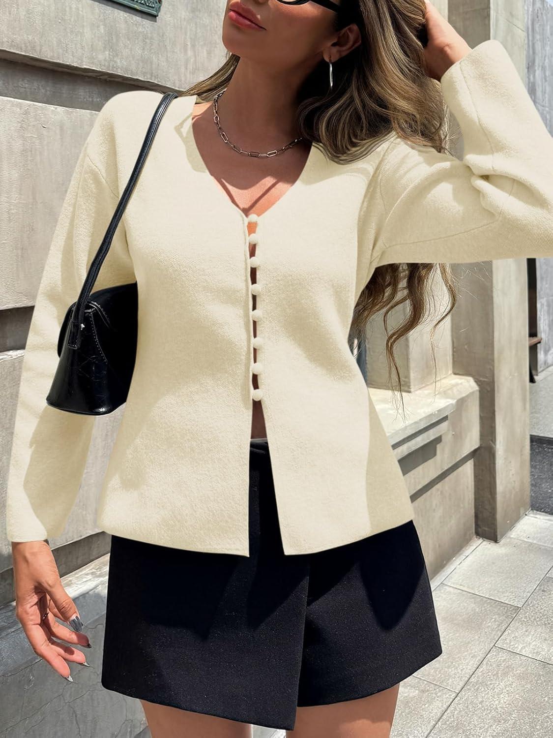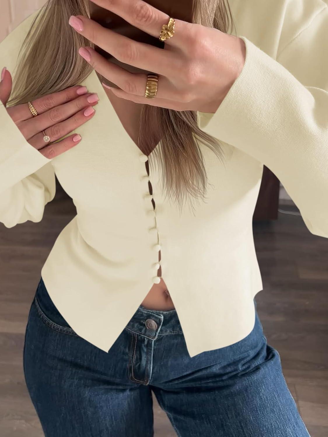 Saodimallsu Womens V Neck Cardigan Sweaters Button Up Fall Trendy Front Split Long Sleeve Sweater Blazer(White)