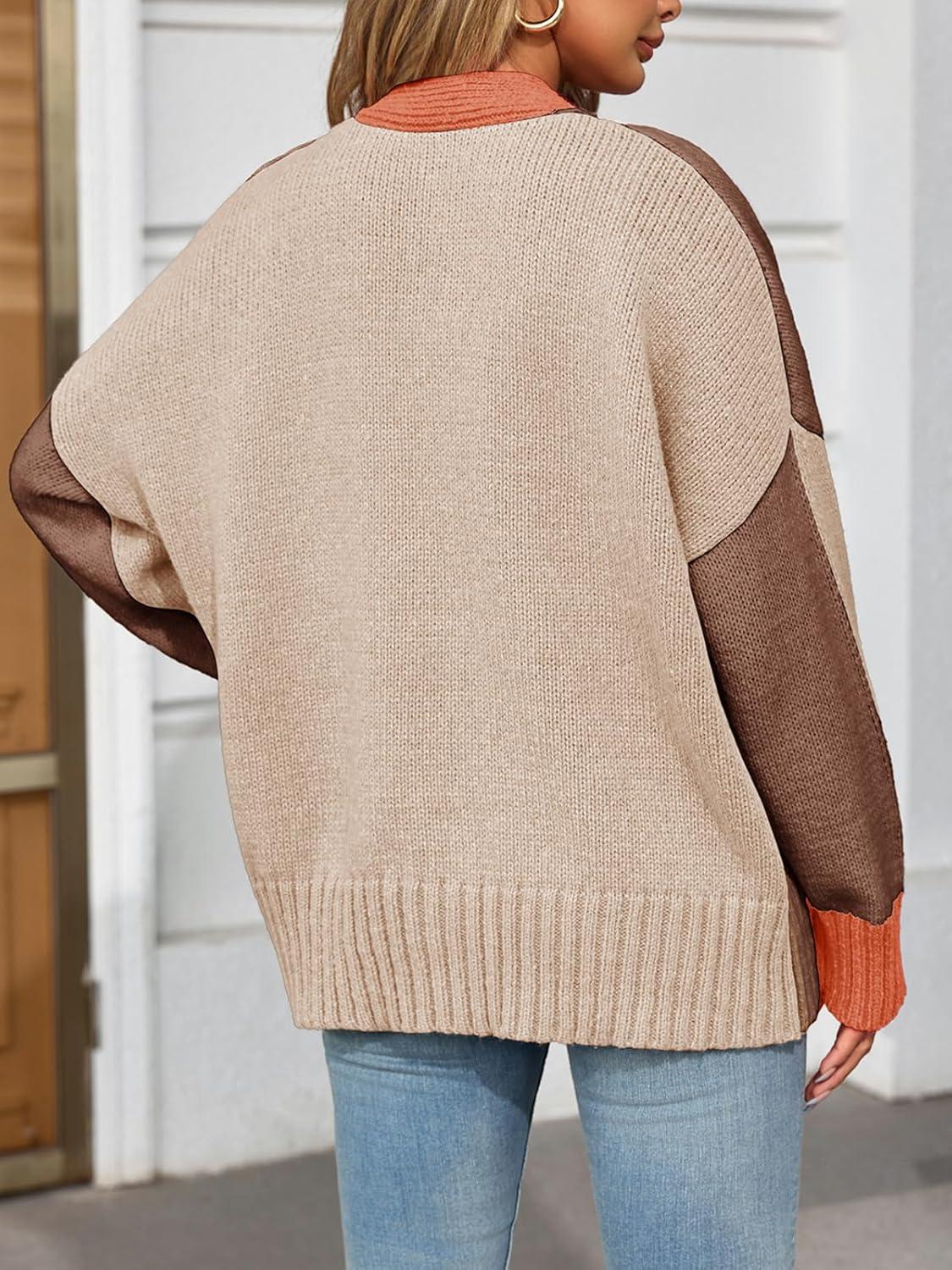 Saodimallsu Womens V Neck Cardigan Sweaters Color Block Button Oversized Long Sleeve Open Front Knit Sweater Coats(Dark Brown)