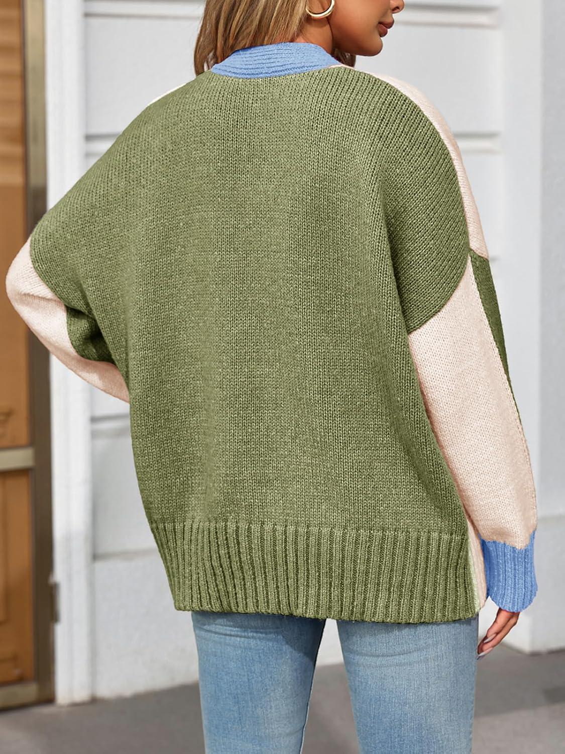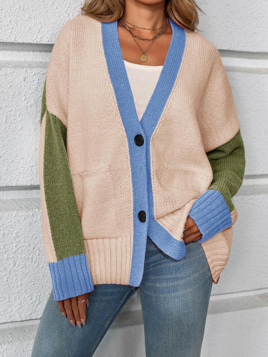 Saodimallsu Womens V Neck Cardigan Sweaters Color Block Button Oversized Long Sleeve Open Front Knit Sweater Coats(Light Khaki)