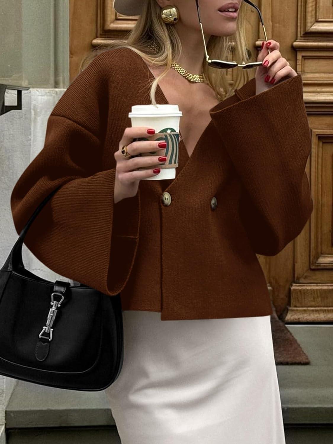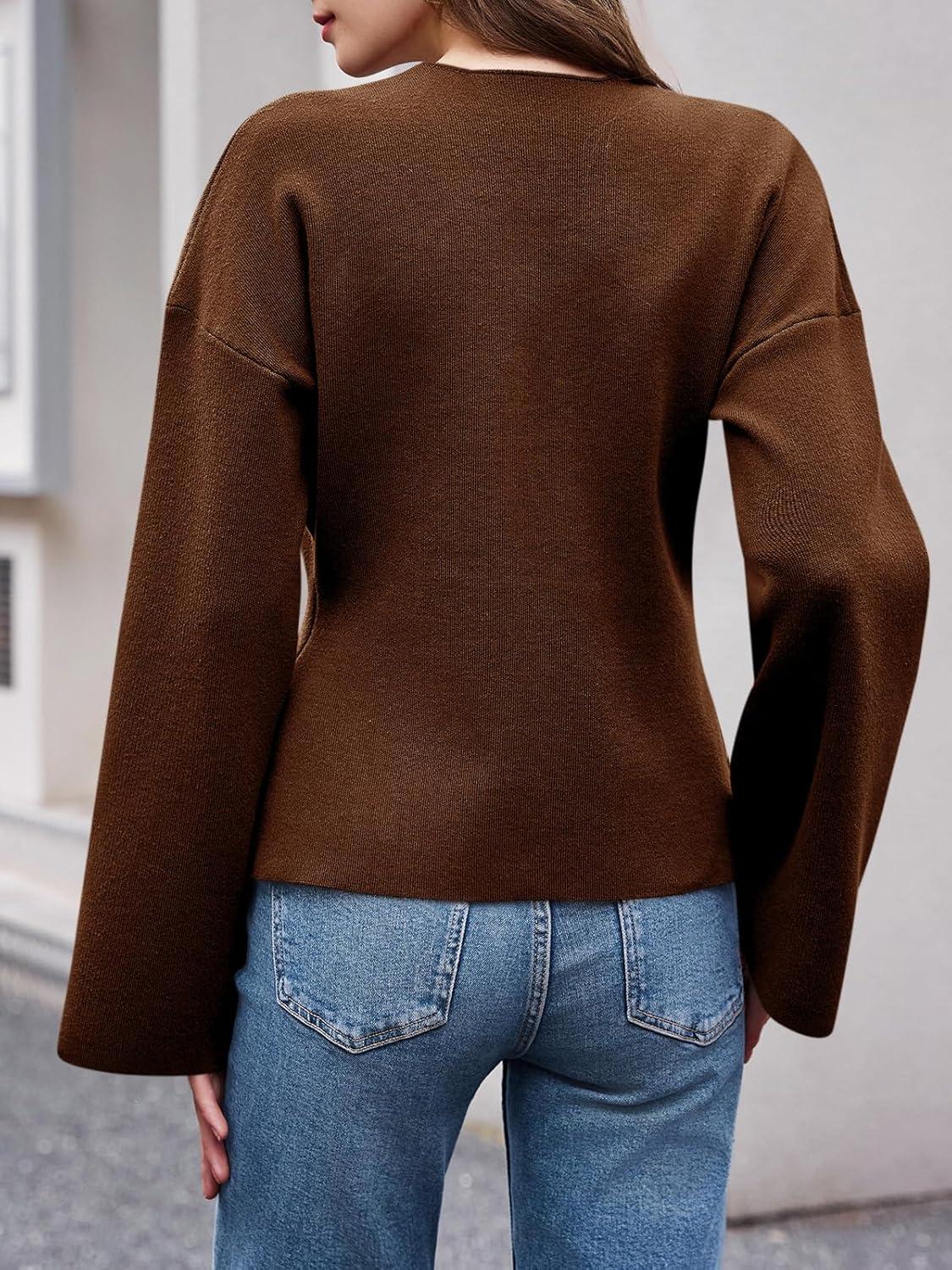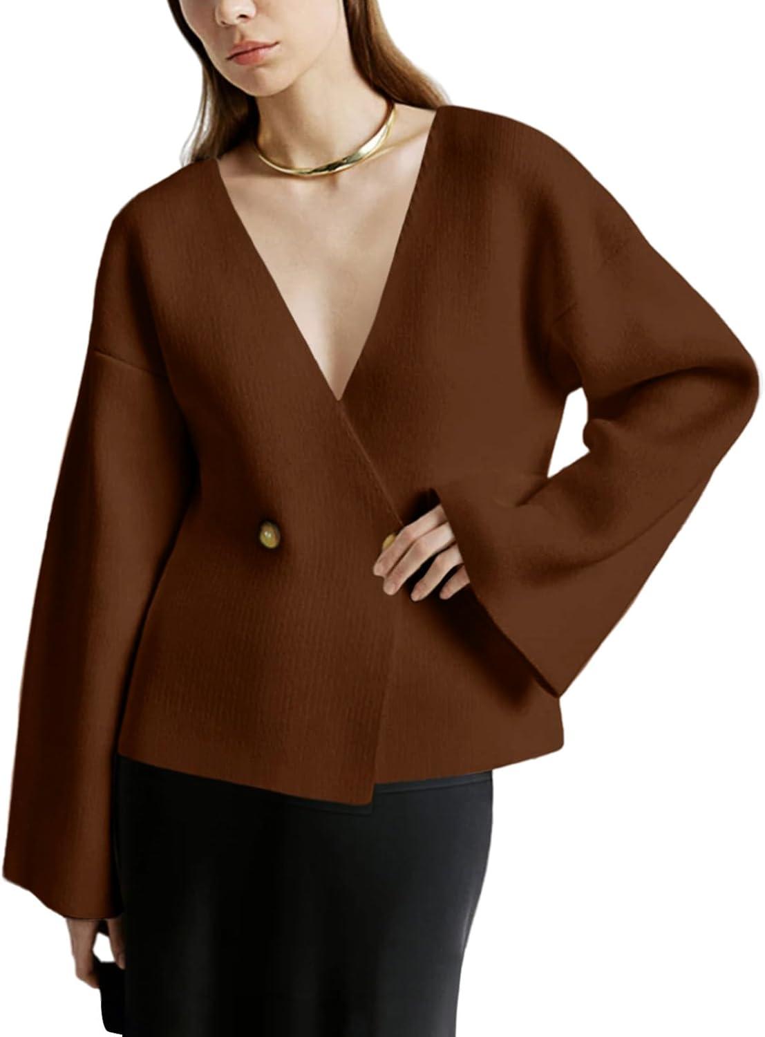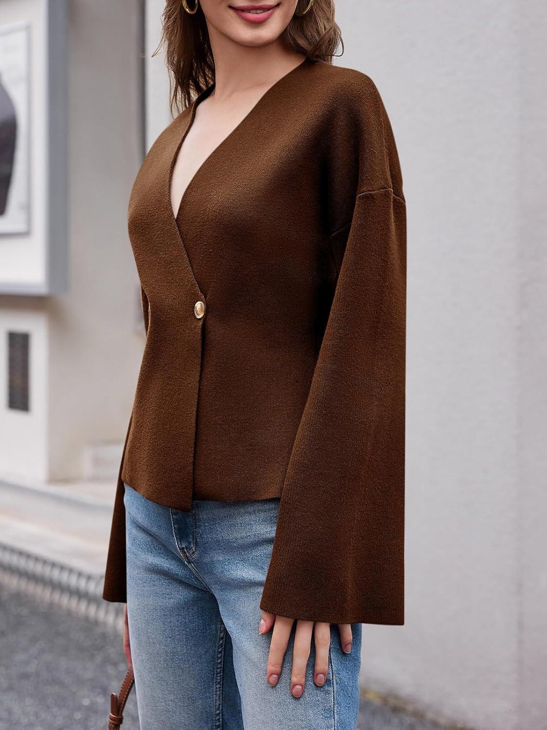 Saodimallsu Womens V Neck Cardigans Long Bell Sleeve Button Down Open Front Loose Knit Fall Sweater Blazer(Brown)