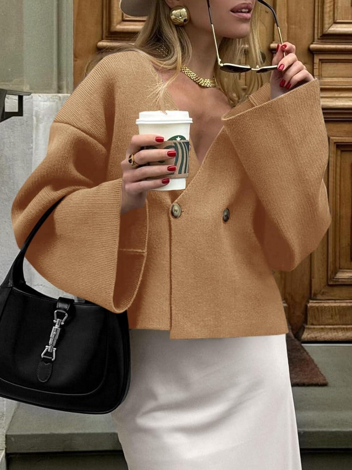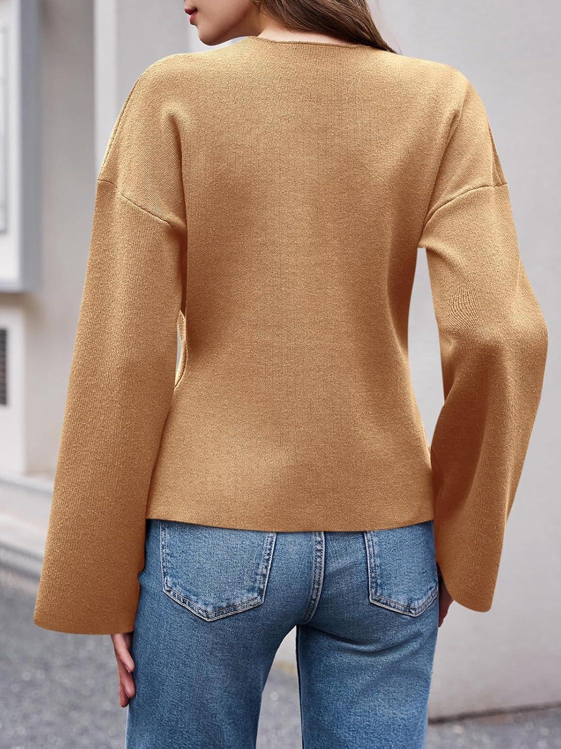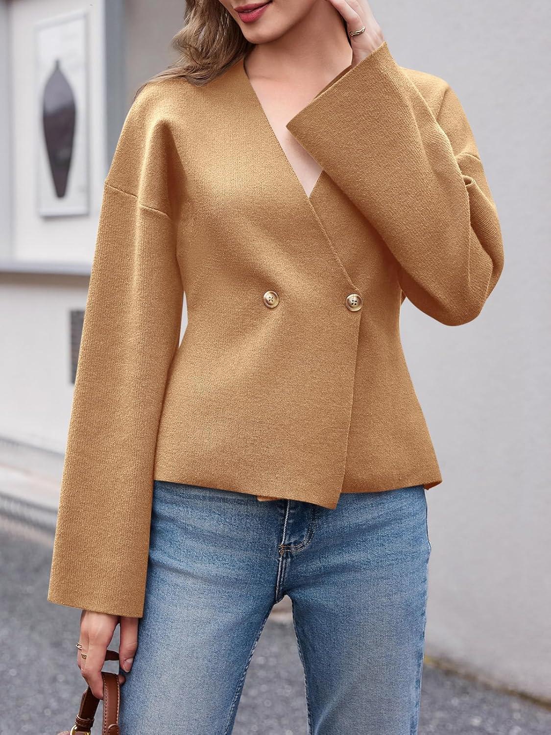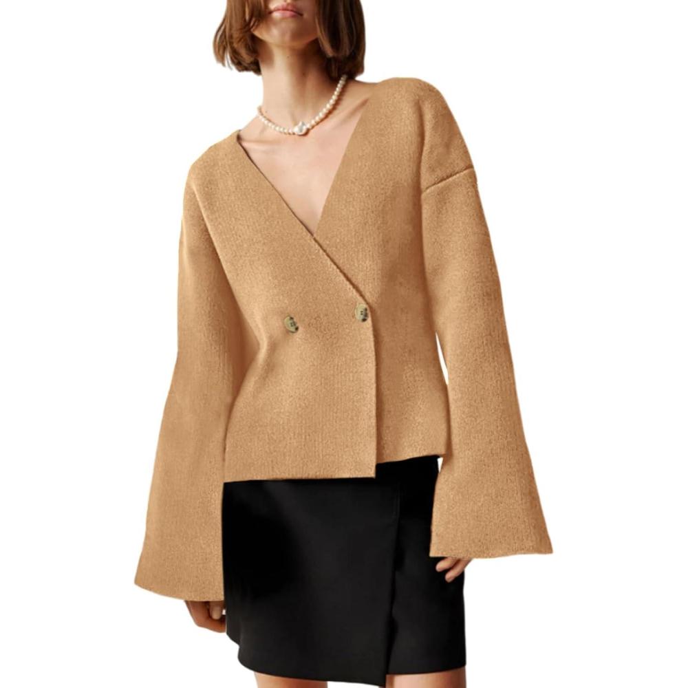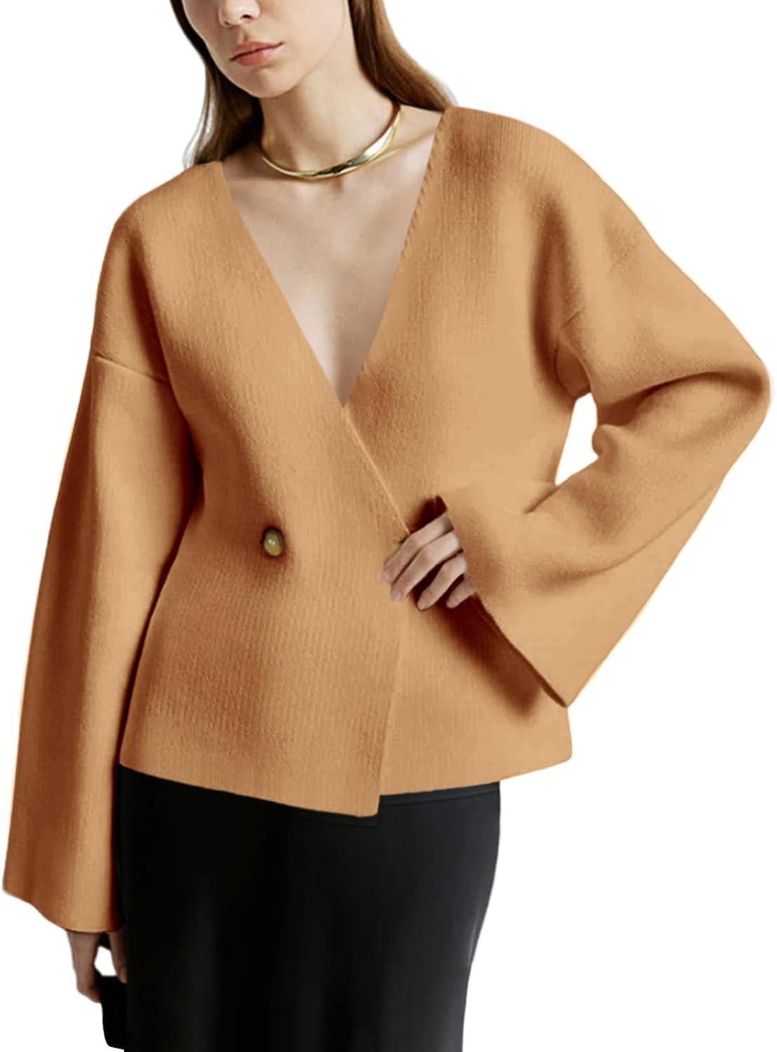 Saodimallsu Womens V Neck Cardigans Long Bell Sleeve Button Down Open Front Loose Knit Fall Sweater Blazer(Camel)