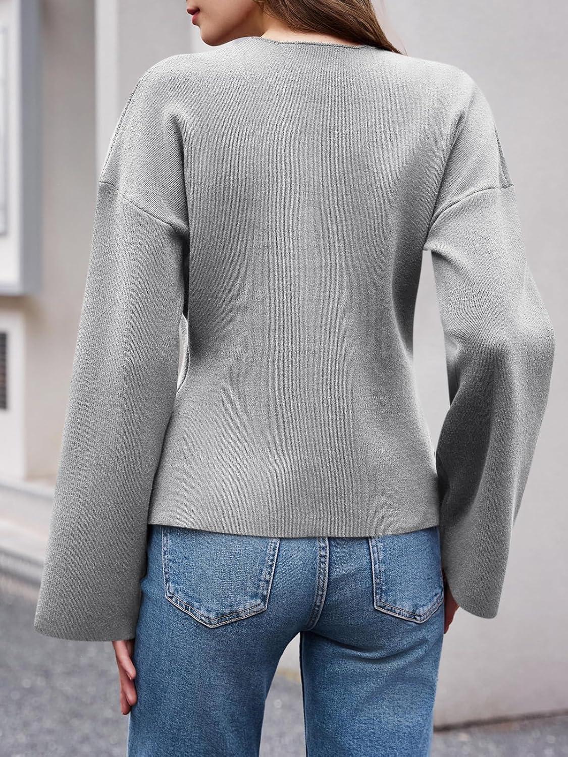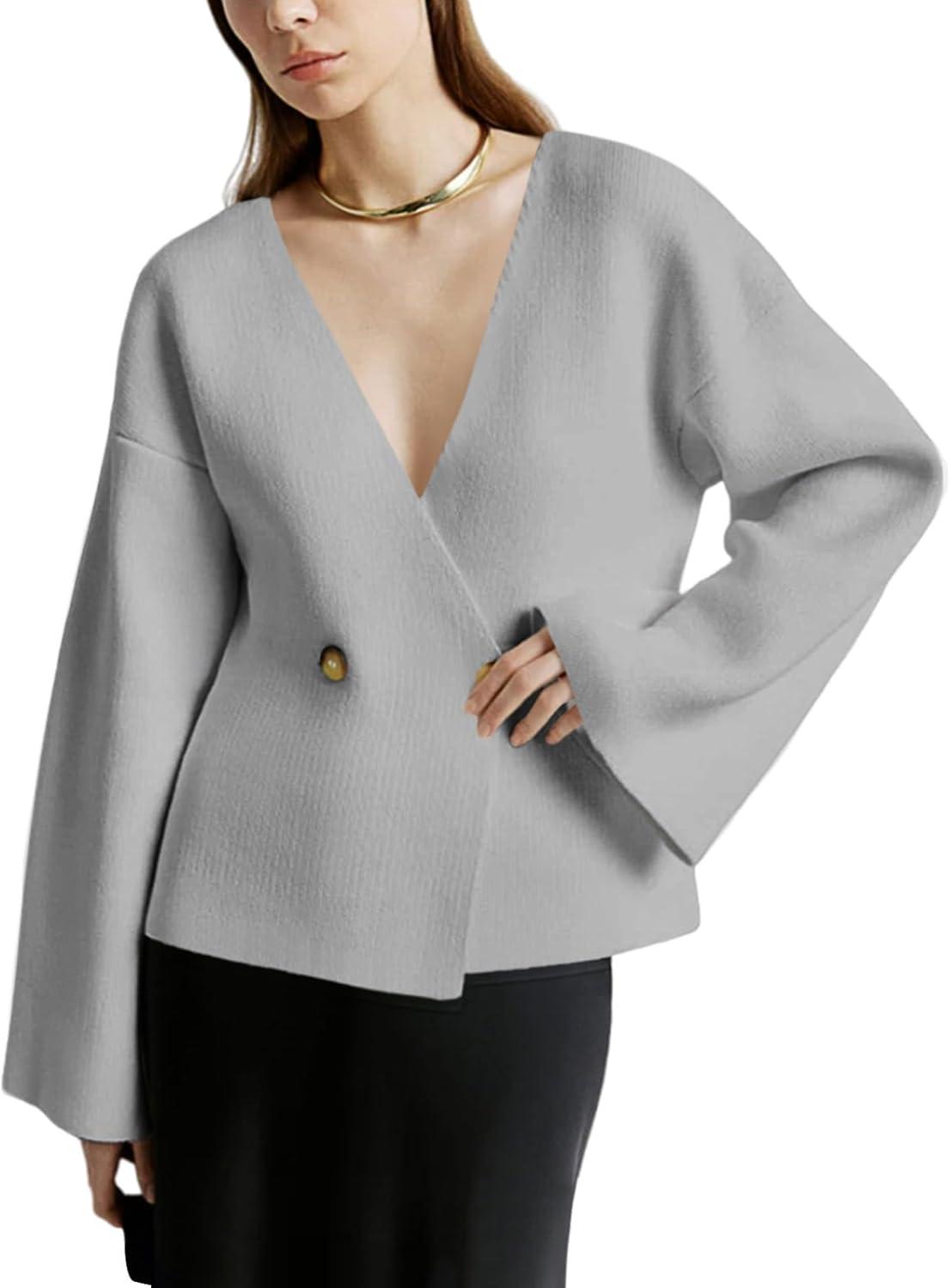 Saodimallsu Womens V Neck Cardigans Long Bell Sleeve Button Down Open Front Loose Knit Fall Sweater Blazer(Gray)