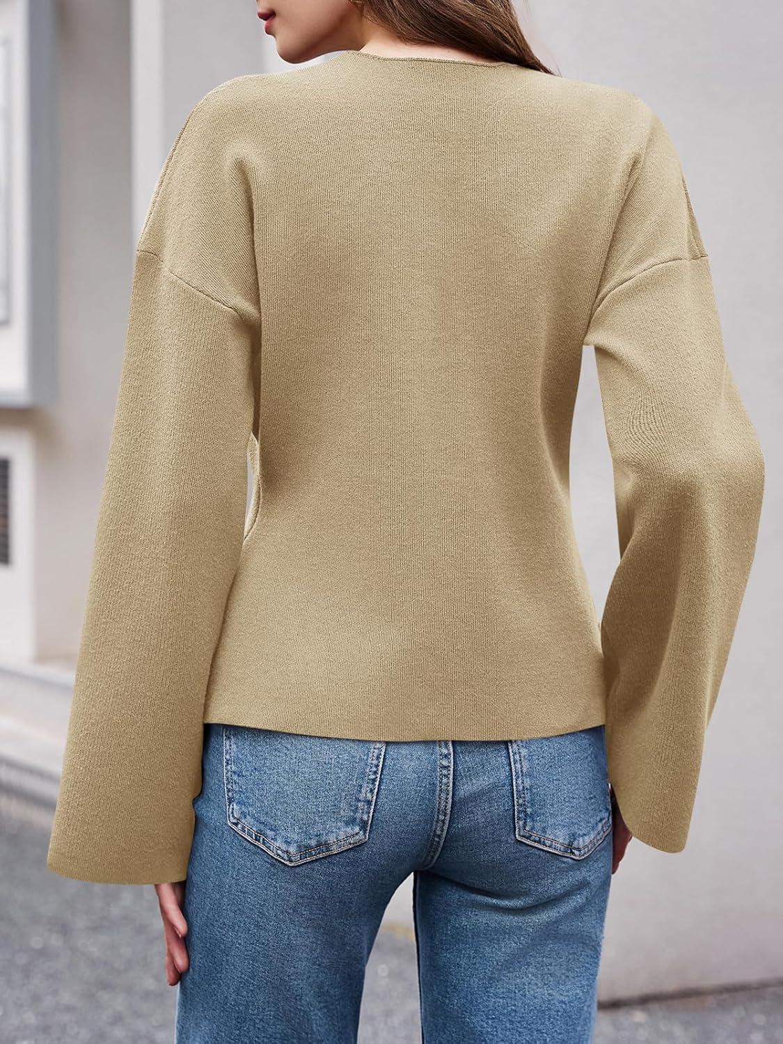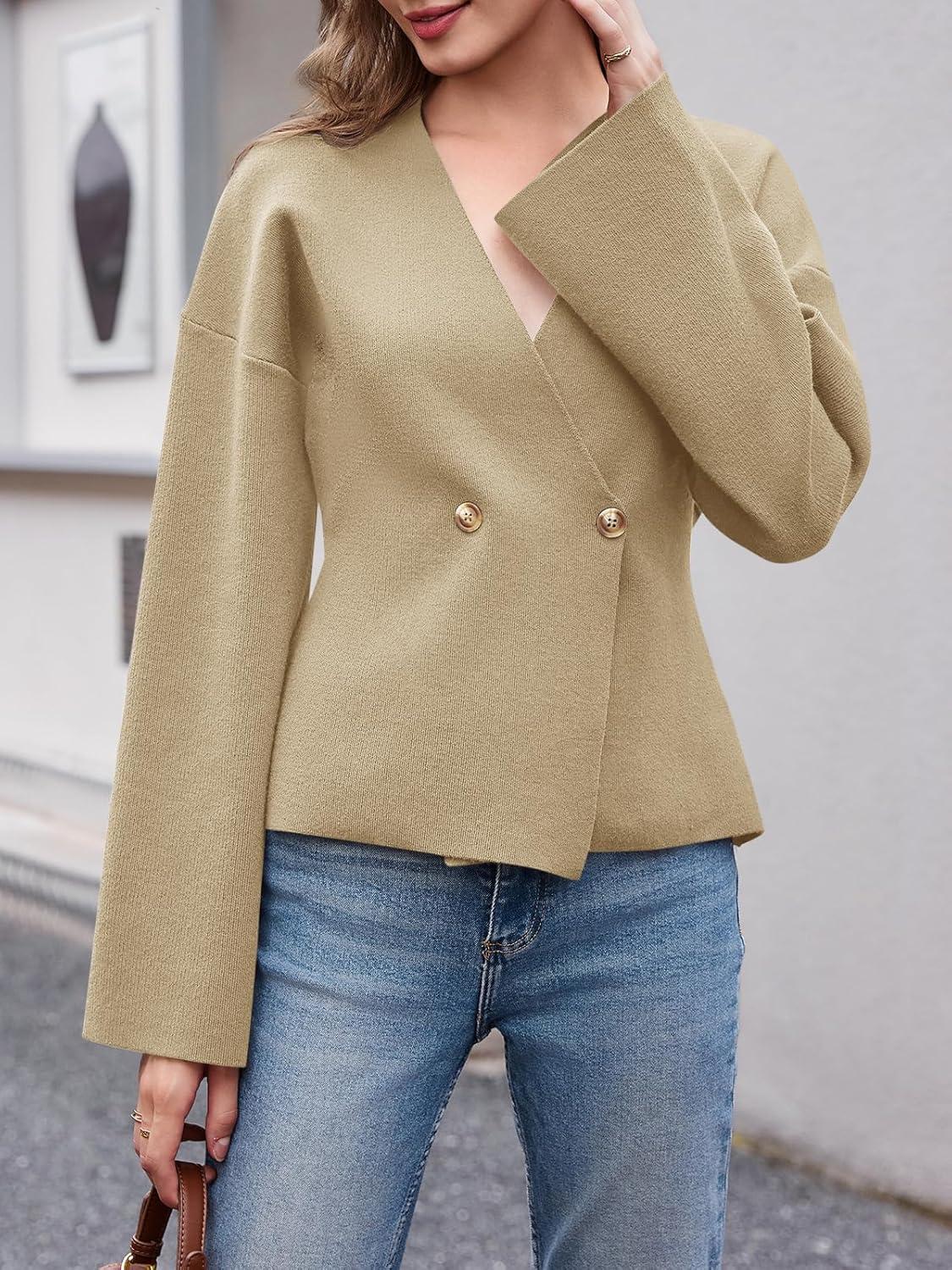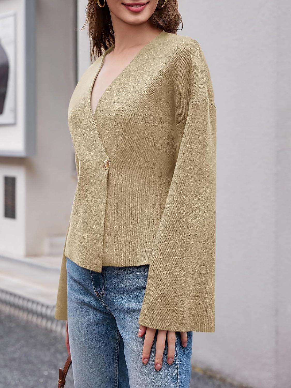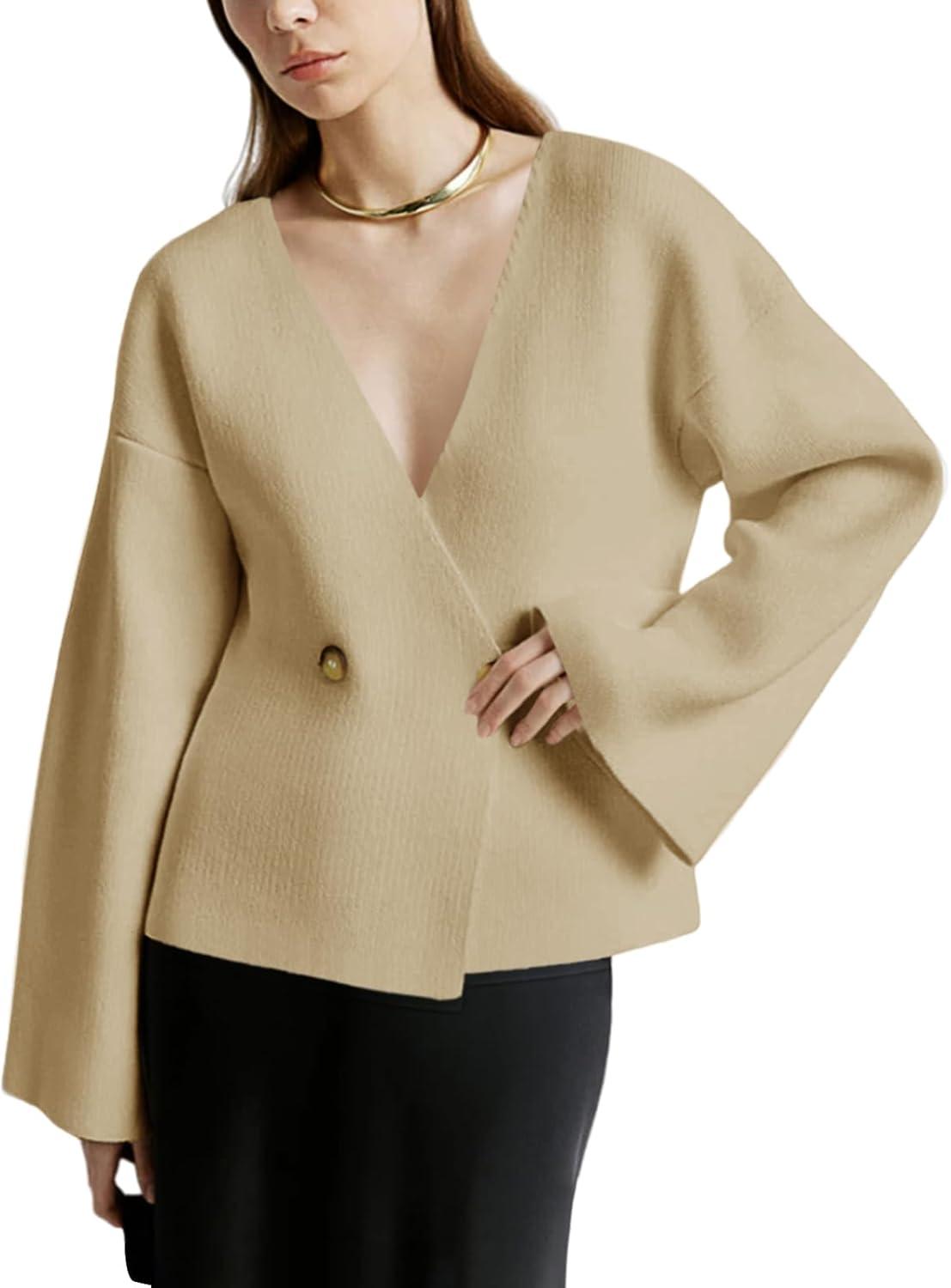 Saodimallsu Womens V Neck Cardigans Long Bell Sleeve Button Down Open Front Loose Knit Fall Sweater Blazer(Khaki)