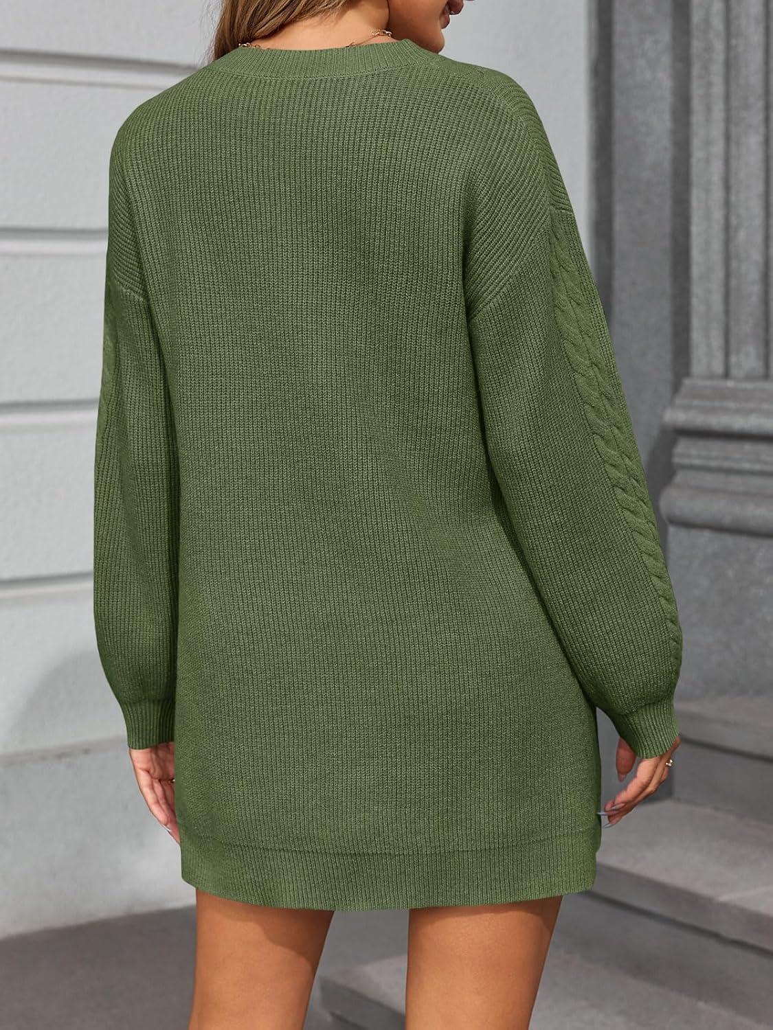 Saodimallsu Womens V Neck Mini Sweater Dress Cable Knit Long Lantern Sleeve Casual Loose Fall Tunic Pullover Sweaters(Army Green)