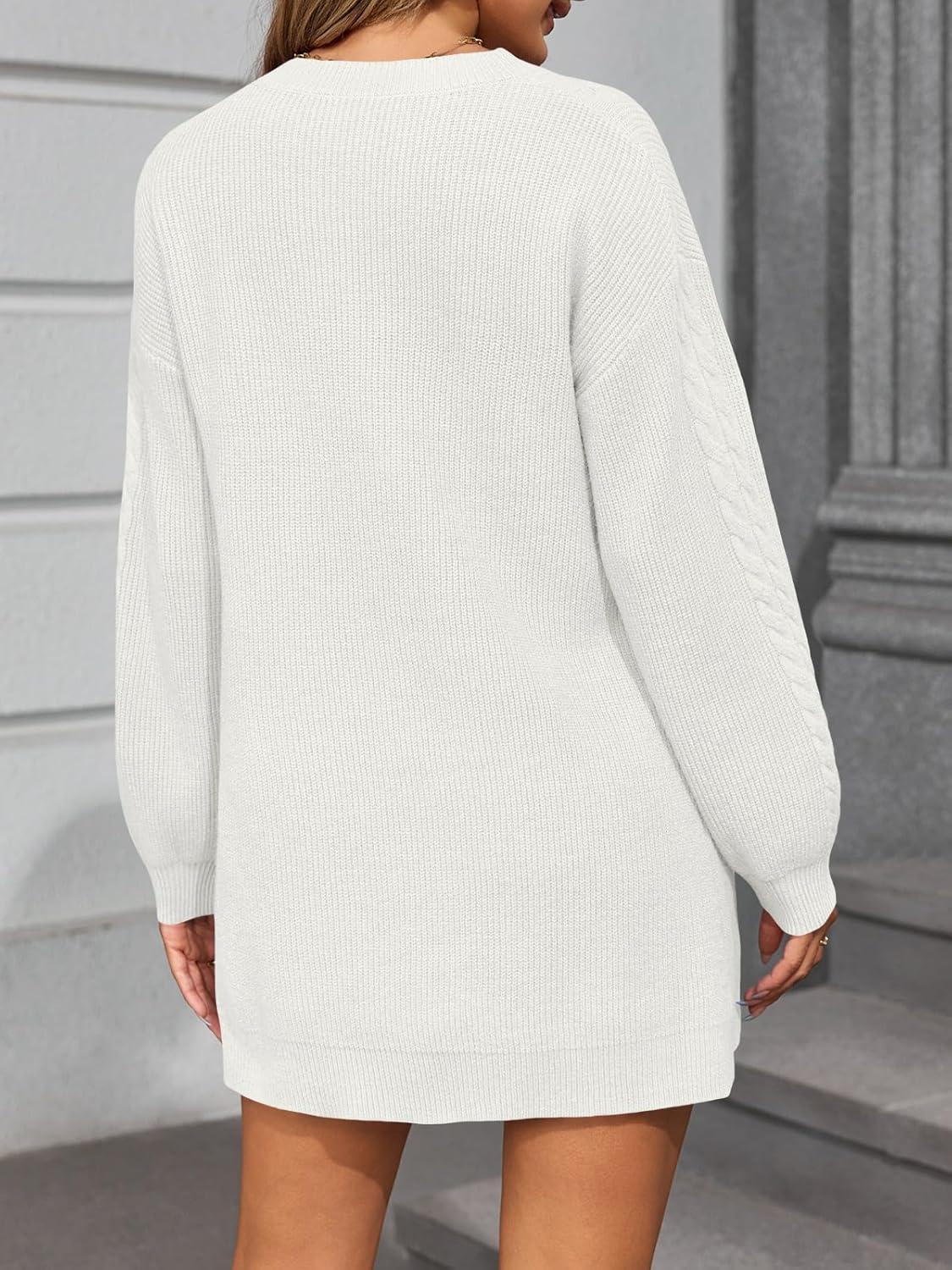 Saodimallsu Womens V Neck Mini Sweater Dress Cable Knit Long Lantern Sleeve Casual Loose Fall Tunic Pullover Sweaters(White)