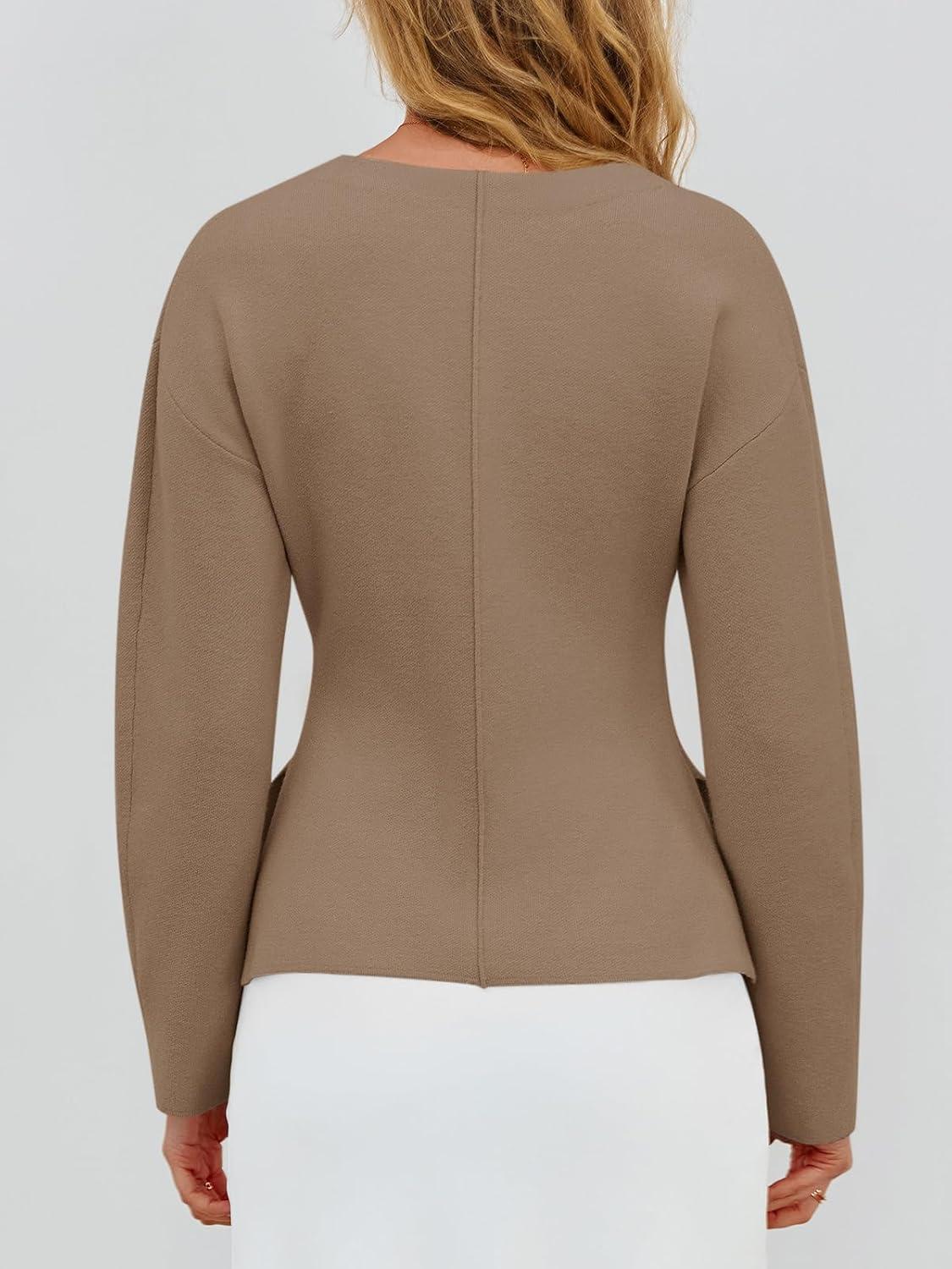 Saodimallsu Womens V Neck Sweater Blazer Peplum Long Sleeve Knit Open Front Split Cardigan Sweaters(Light Khaki)