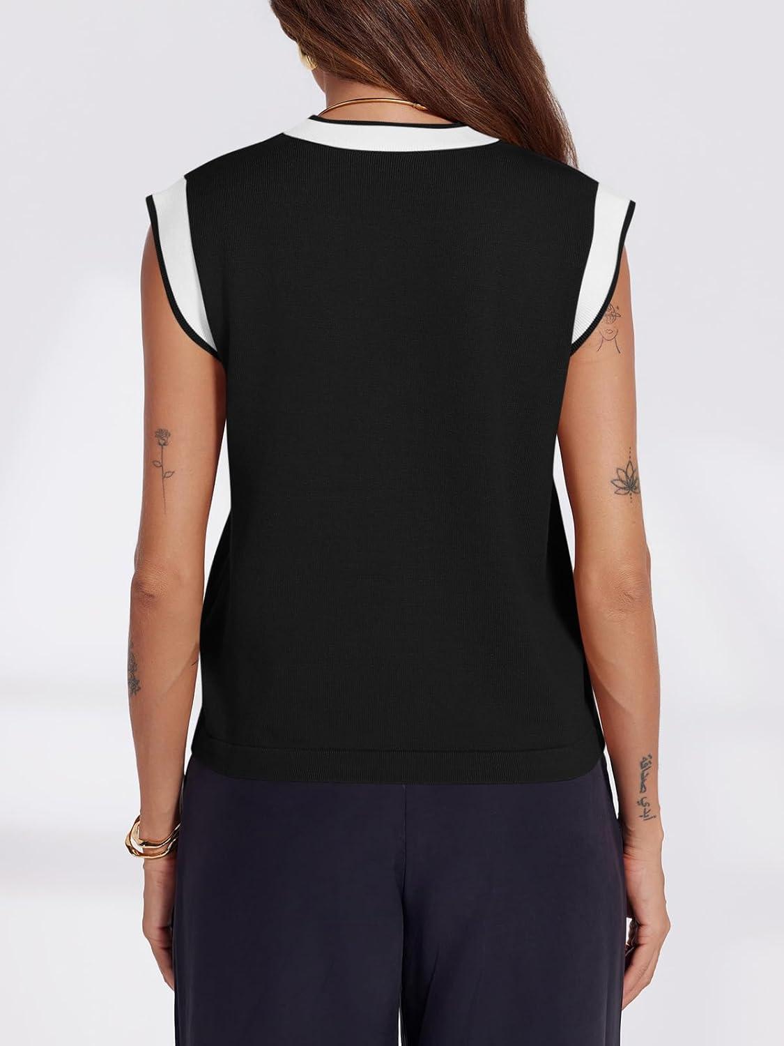 Saodimallsu Womens V Neck Sweater Vest Button Down Cap Sleeve Summer Trendy Color Block Loose Knit Tank Tops(Black)