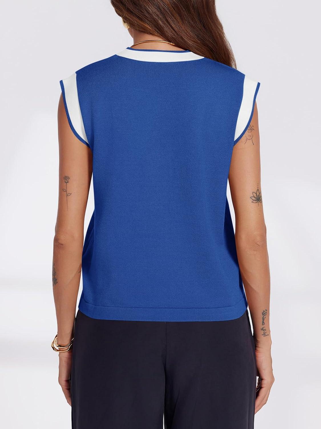 Saodimallsu Womens V Neck Sweater Vest Button Down Cap Sleeve Summer Trendy Color Block Loose Knit Tank Tops(Blue)