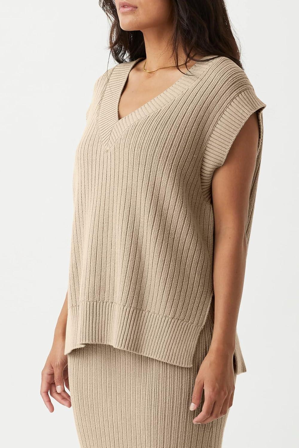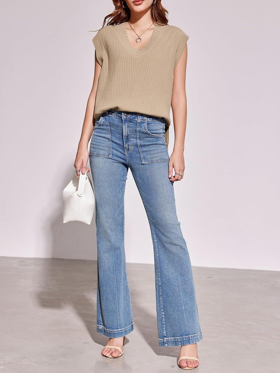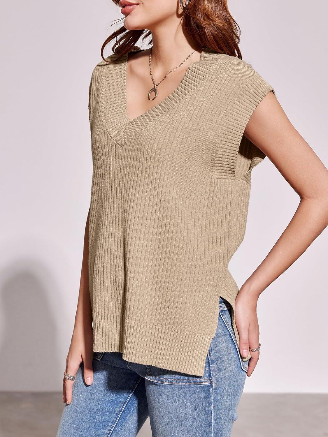 Saodimallsu Womens V Neck Sweater Vest Oversized Ribbed Knit Sleeveless Casual Loose Fit Pullover Tank Top(Khaki)