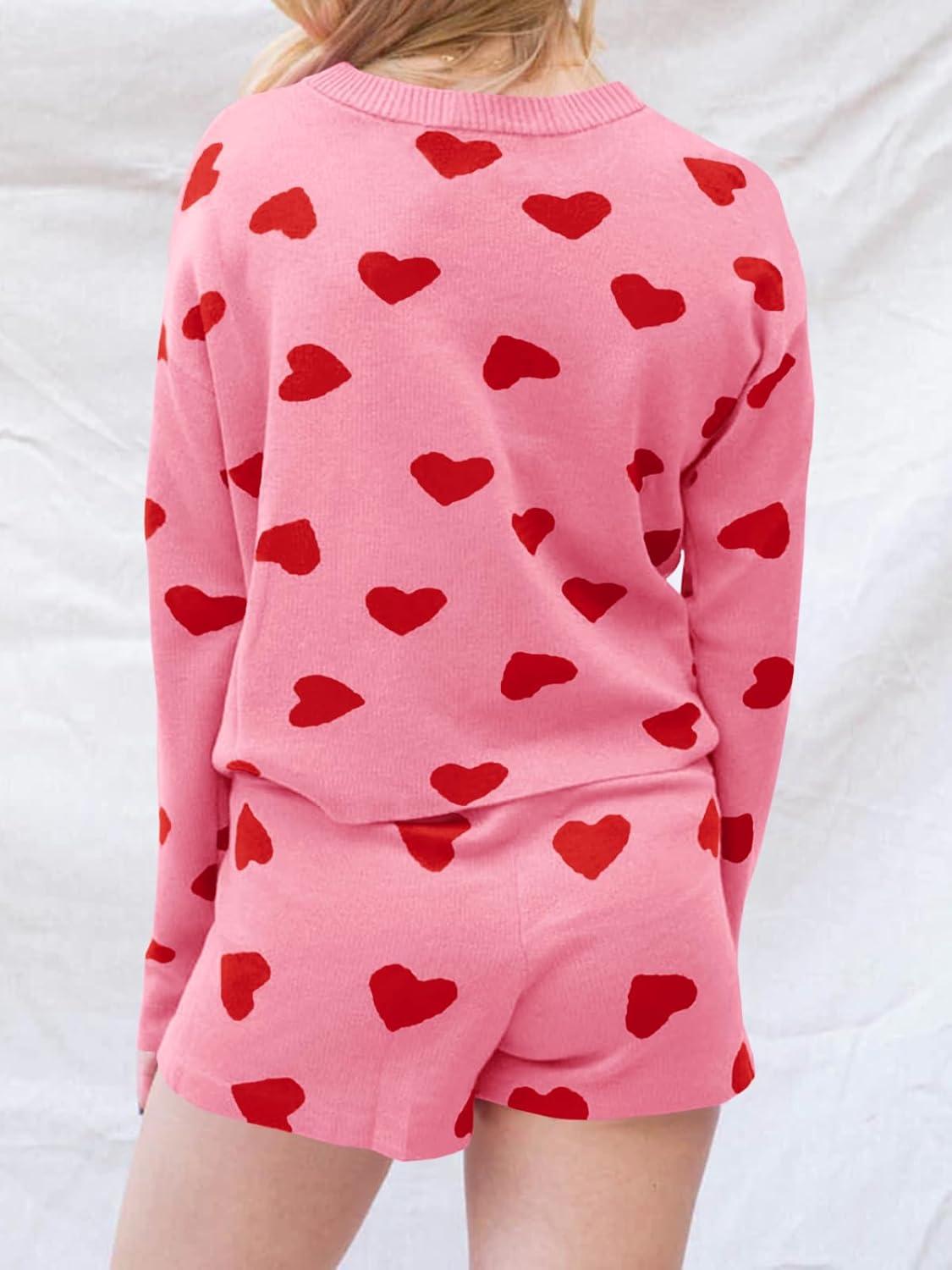 Saodimallsu Womens Valentine’s Day Pajama Sets Hearts Print Lounge Set Long Sleeve Sweater and Shorts 2 Piece Outfits(Pink)