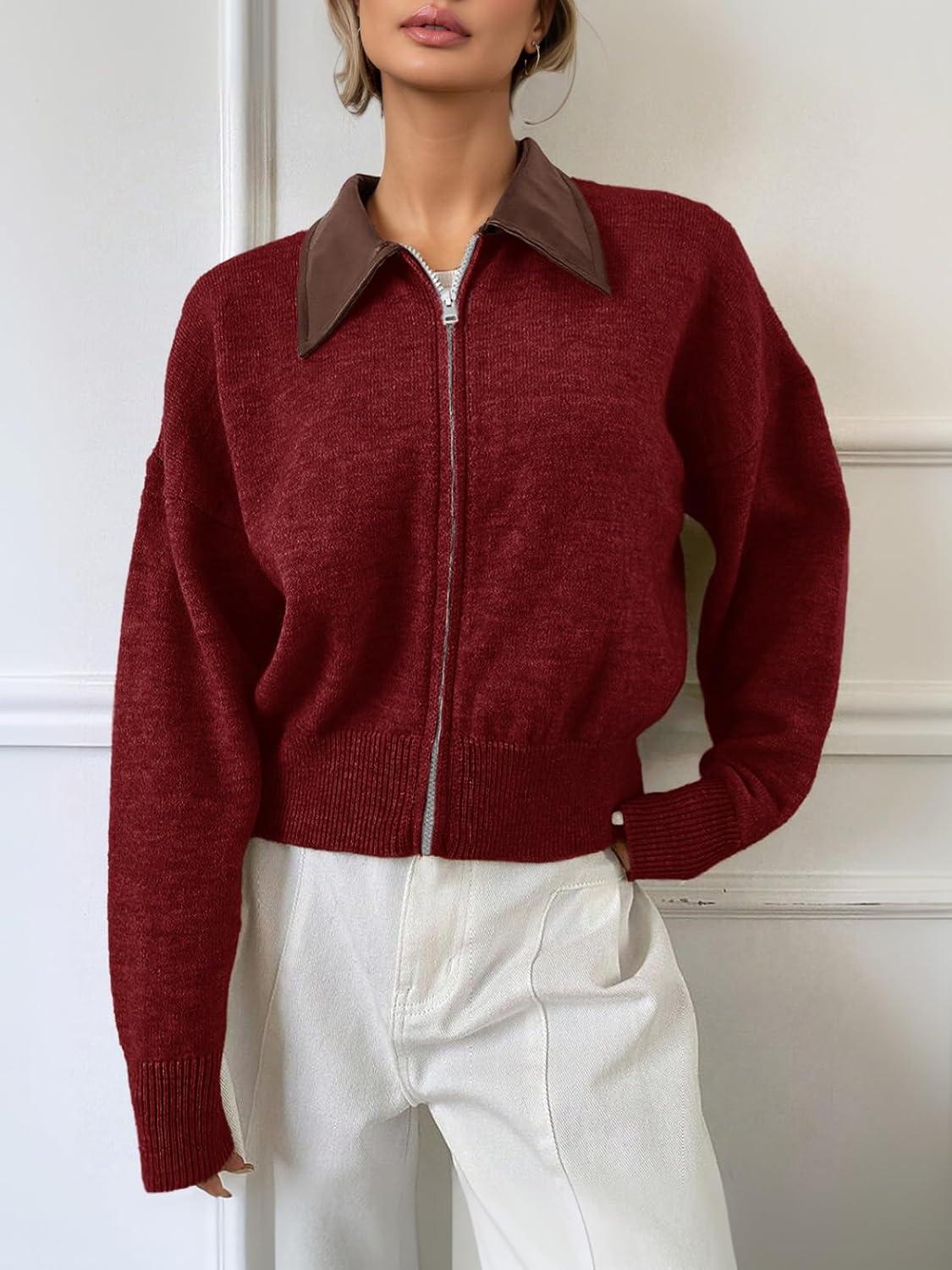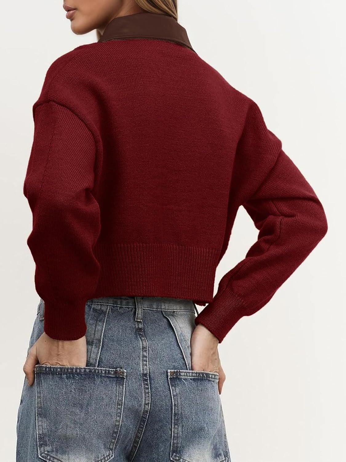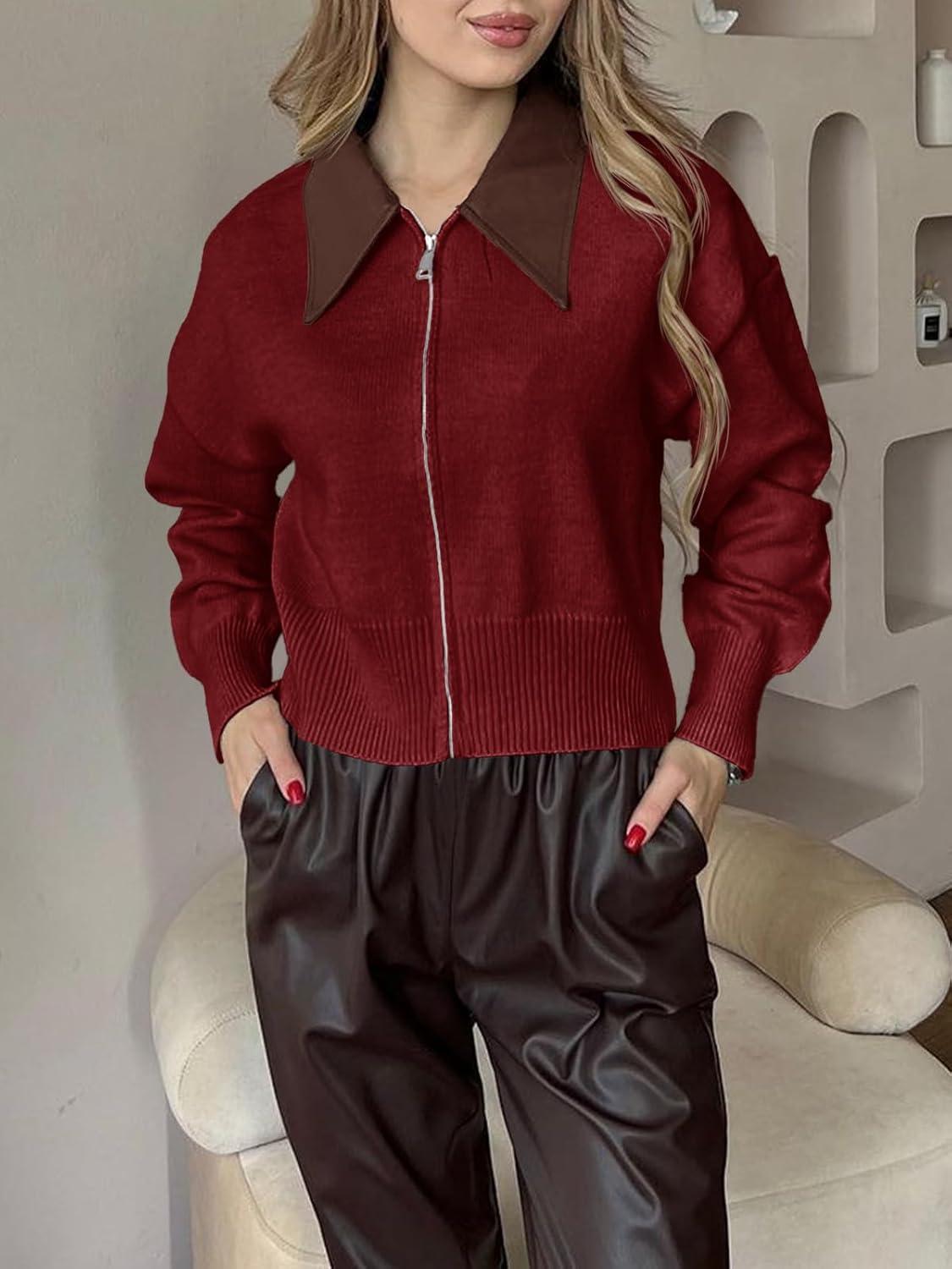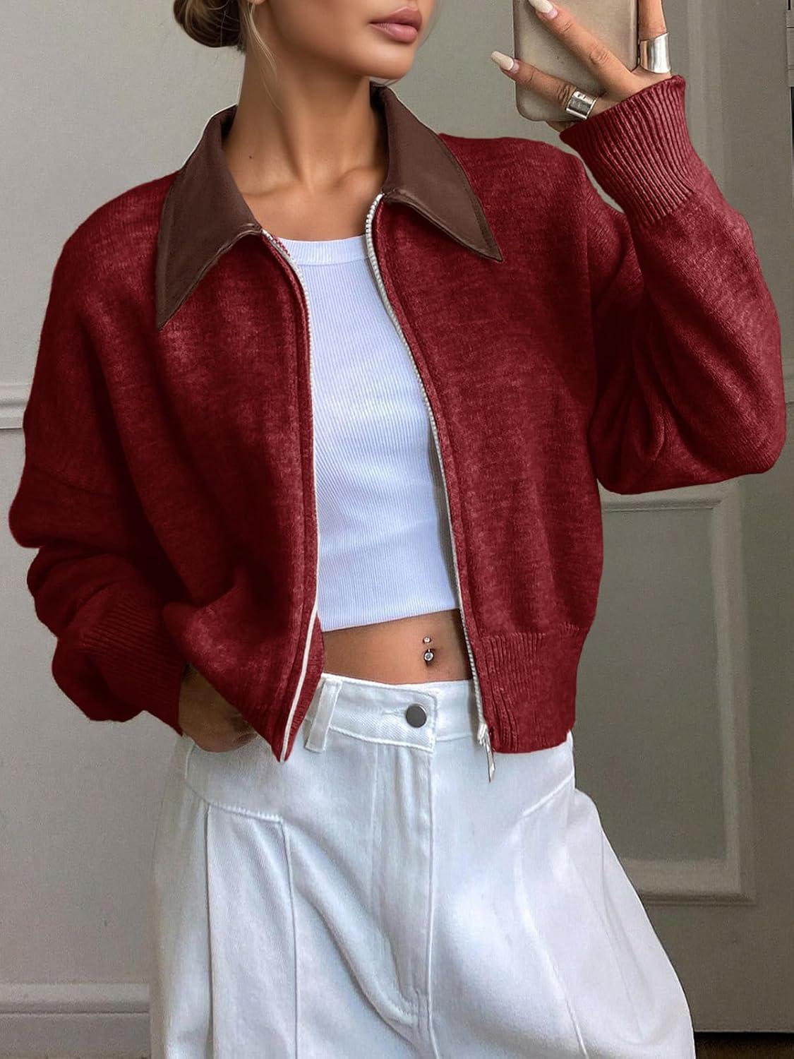 Saodimallsu Womens Zip Up Barn Jacket Cropped Faux Leather Collared Open Front Long Sleeve Fall Cardigan Sweaters(Burgundy)